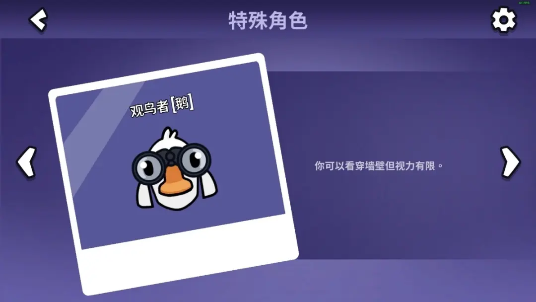 技能是可以视线穿透墙壁,很经典的情景就是狼隔着墙壁刀人的时候,观鸟者在墙壁另一侧默默观看😂很好玩的职业,而且比较无脑,糖白我有一次发现朋友是鹈鹕吃人,直接开麦大喊,叫来了凑巧路过的正义使者