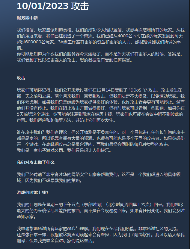 目前官方已聘请网络安全专家进行协助,计划在北京时间周四早上6点左右重新开放服务器,进不去的玩家们请耐心等待。