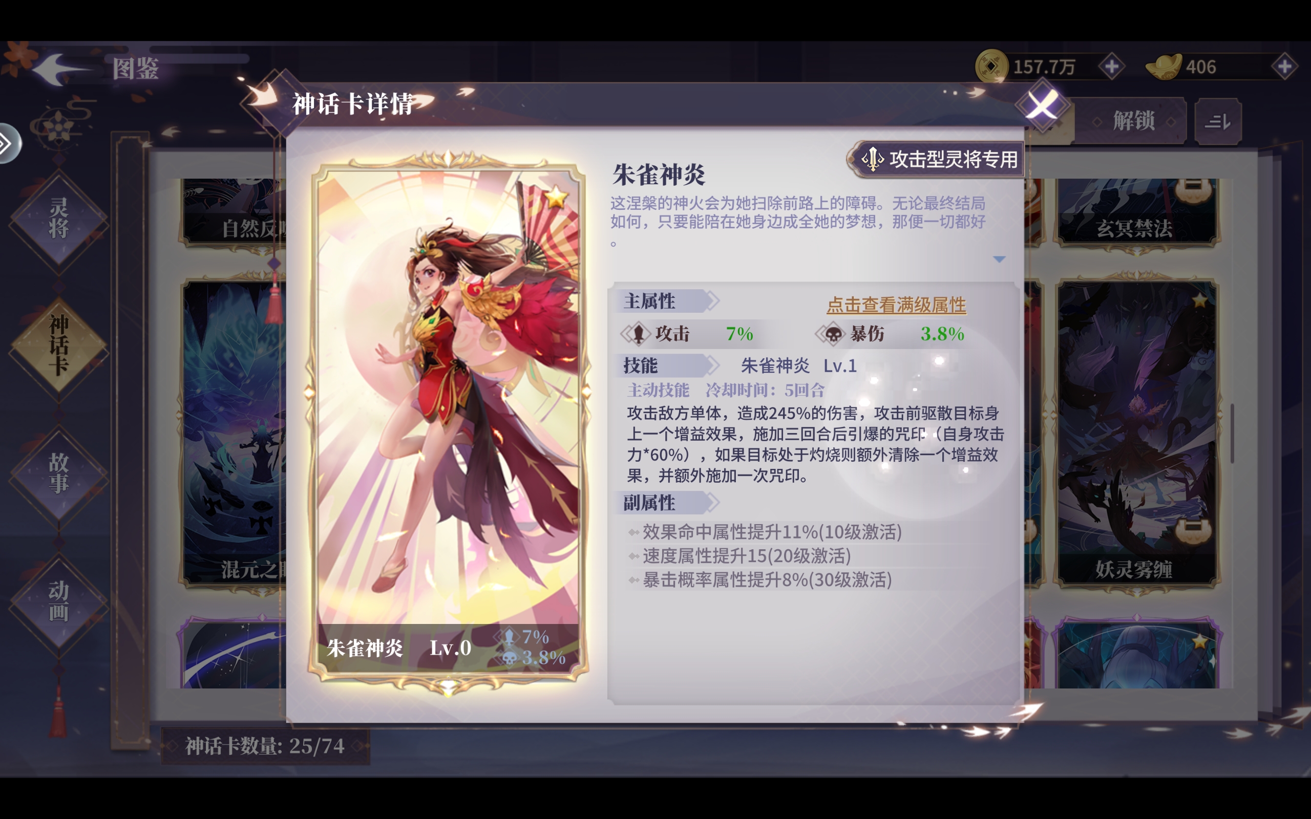 朱雀专属神话卡:朱雀神炎无疑是最契合朱雀的神话卡,但如果前期预算不足或者抽卡运气较差的时候,橙色神话卡炽焰惩击,双翼风雷与紫色神话卡烈炎杀阵也可以作为一定程度上的平替。