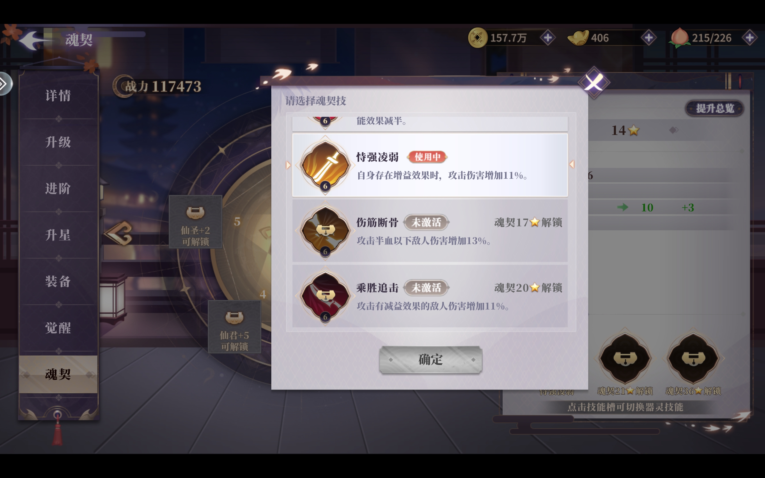在三个魂契槽中,第一个选择恃强凌弱。因为朱雀需要处于队伍速度一号位或者二号位,并且本身位置较为安全,所以单纯的攻击加成效果会更好。第二魂契选择无限火力或嗜血成性或先手为强,没有吸血属性选择嗜血成性,没有速度属性选先手为强,两者都有可以选择无限火力。第三个魂契选择穿心碎甲,配合恃强凌弱与无限火力效果颇佳。