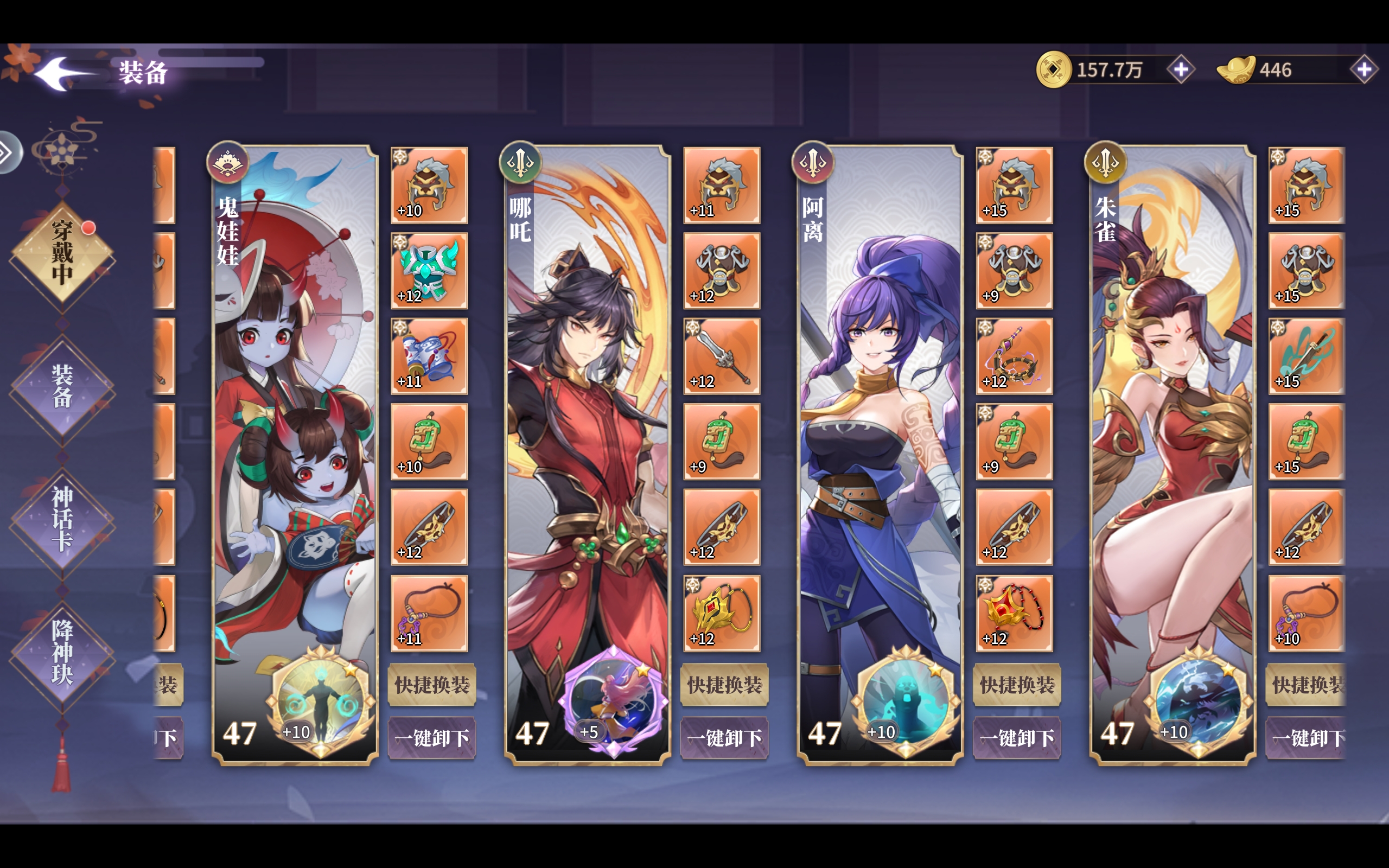 在神将搭配上,朱雀较为百搭并没有固定阵容,比较契合的神卡是哪吒,且哪吒需要速度低于朱雀,朱雀大招附加灼烧效果后,哪吒的大招将在原有基础上打出额外20%伤害,搭配清场效果奇佳,适合前中期快速刷本。
