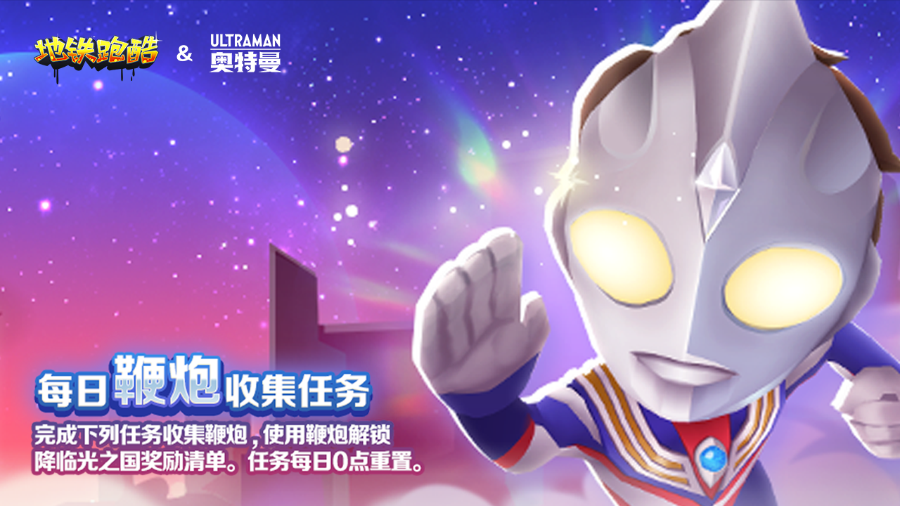 你相信光吗?每日前往无尽模式赛道或通过完成任务收集「鞭炮」,就可解锁奥特曼联动限定形象「迪迦杰克」&「胜利飞燕」&「神光棒」!!
