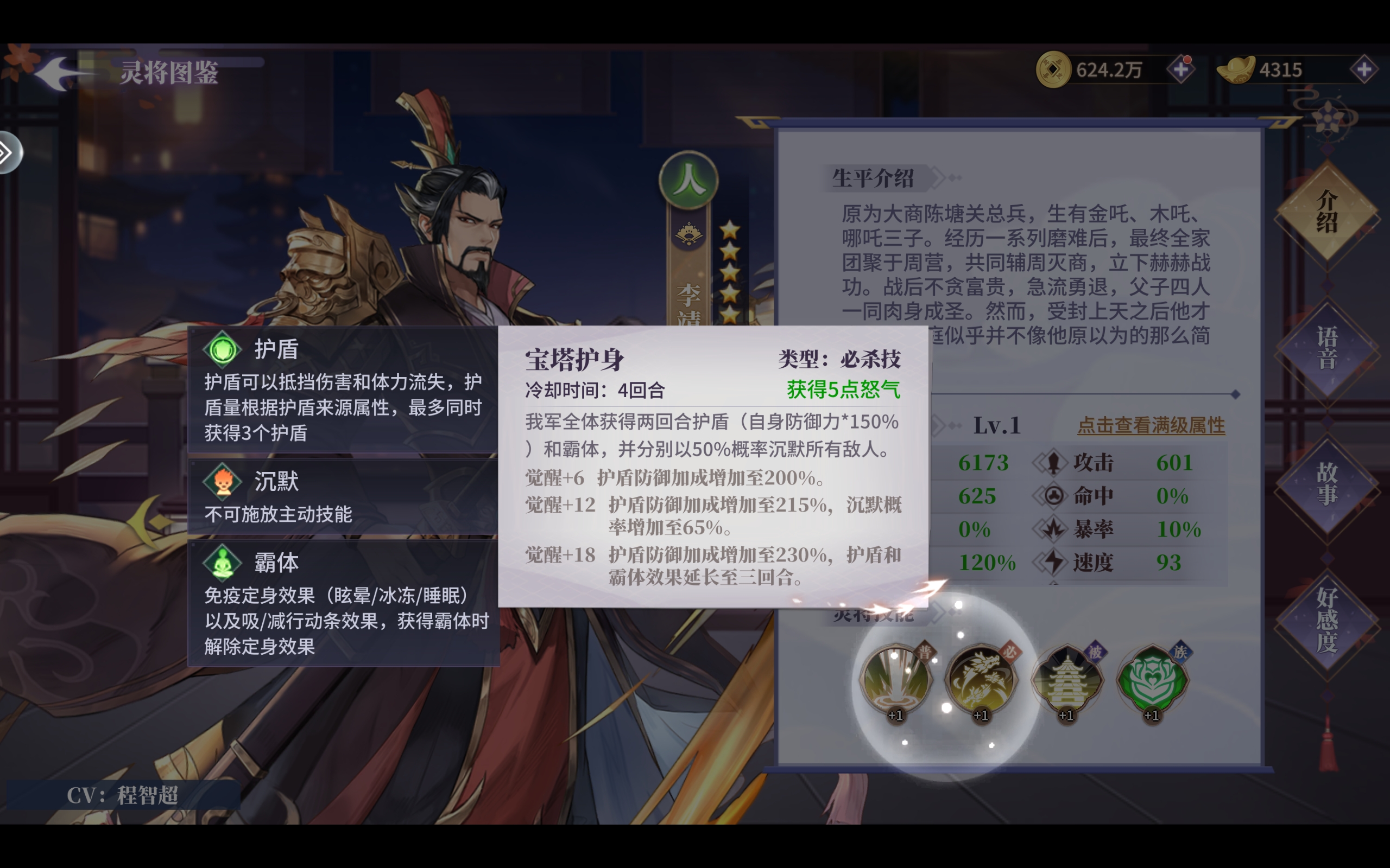 青龙本身存在克星吗?其实是有的,最主要的就是人族技巧型型灵将李靖,李靖的大招宝塔护体能够为全队提供霸体效果,自然可以防住青龙的冰冻,不过比较满意处理的一点在于青龙本身这带移速加成,并且李靖满级属性的速度低两点,因此同样练度与属性条的李靖其实是无法有效防止住青龙的冰冻效果的。