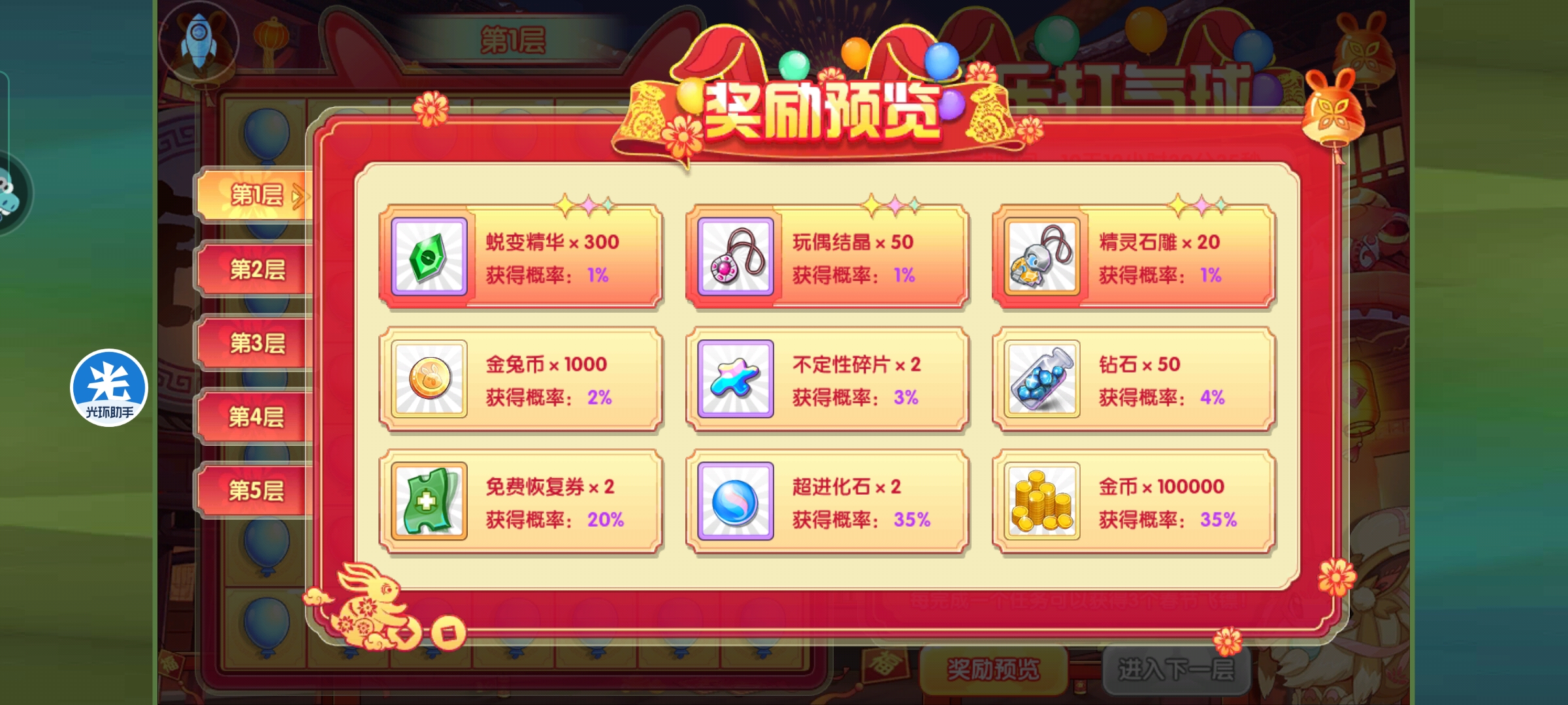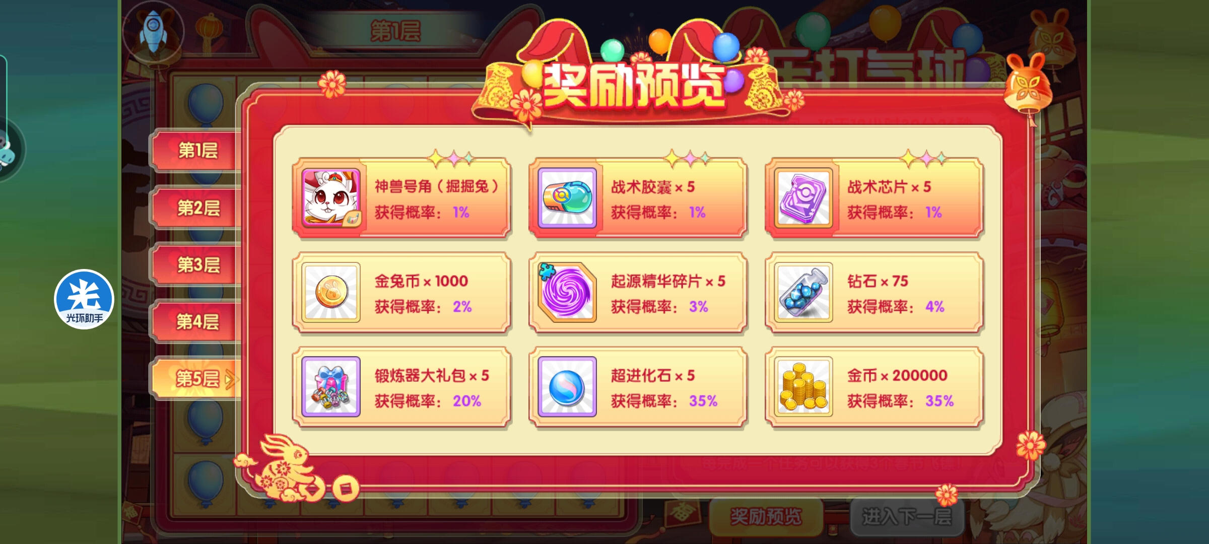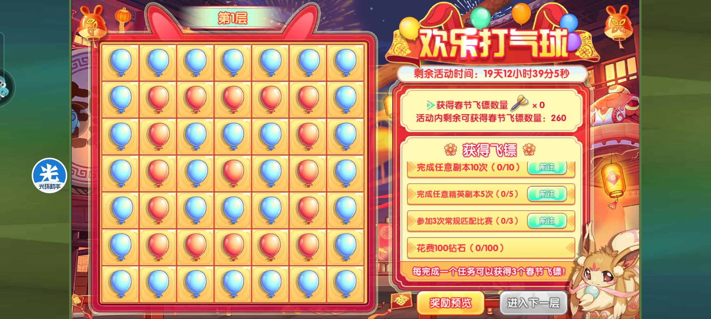 春节活动之欢乐打气球清风江明月发布于 2023-01-13关注炊示打气球这个活动挺简单的,就是毎天完成指定任务可以領取活动。 活动如图,就是每天联盟三次,王者一次,副本10次,精英副本五次,三次pvp,花钻石100,就可以领取所有春节飞镖。 必须先选择本轮想要得的奖励オ可以开始游戏。就是精华,石雕,结晶三个。 在本轮奖励之后,可以自由选择是否前往下一关。 奖励如图,每层都是随机获取的。这里材料都是完整的,不需要碎片合成。 年兽倔倔兔子和啪啪兔子也是这个副本获取,这个副本完全通关,可以获得两只年兽和5000的金兔币。