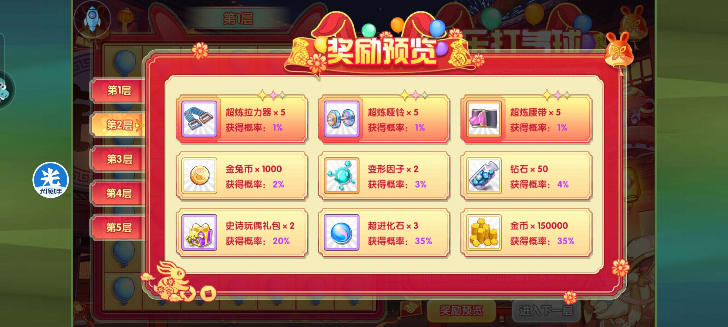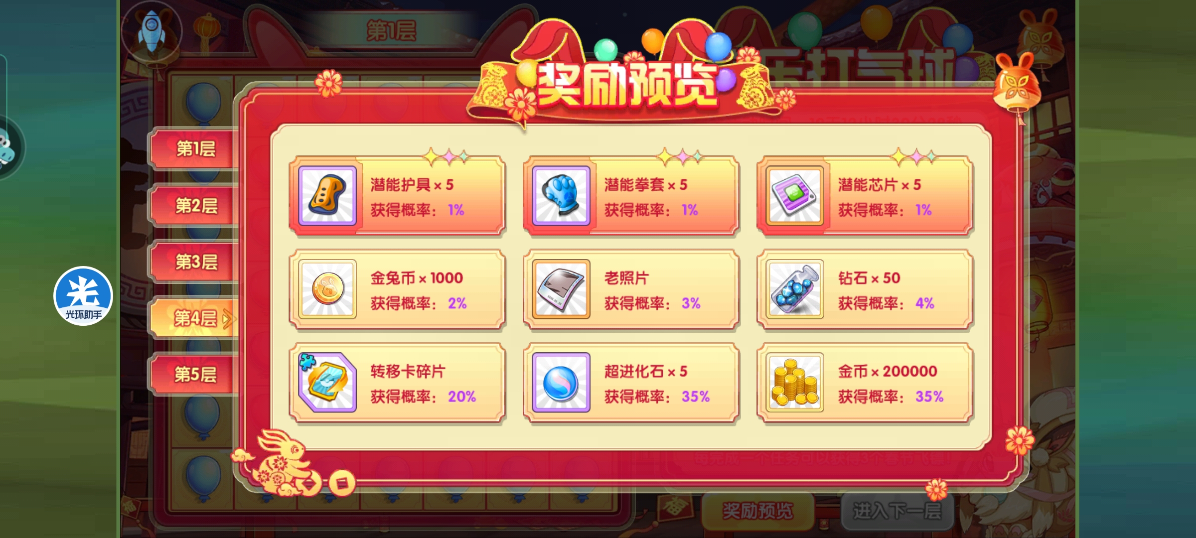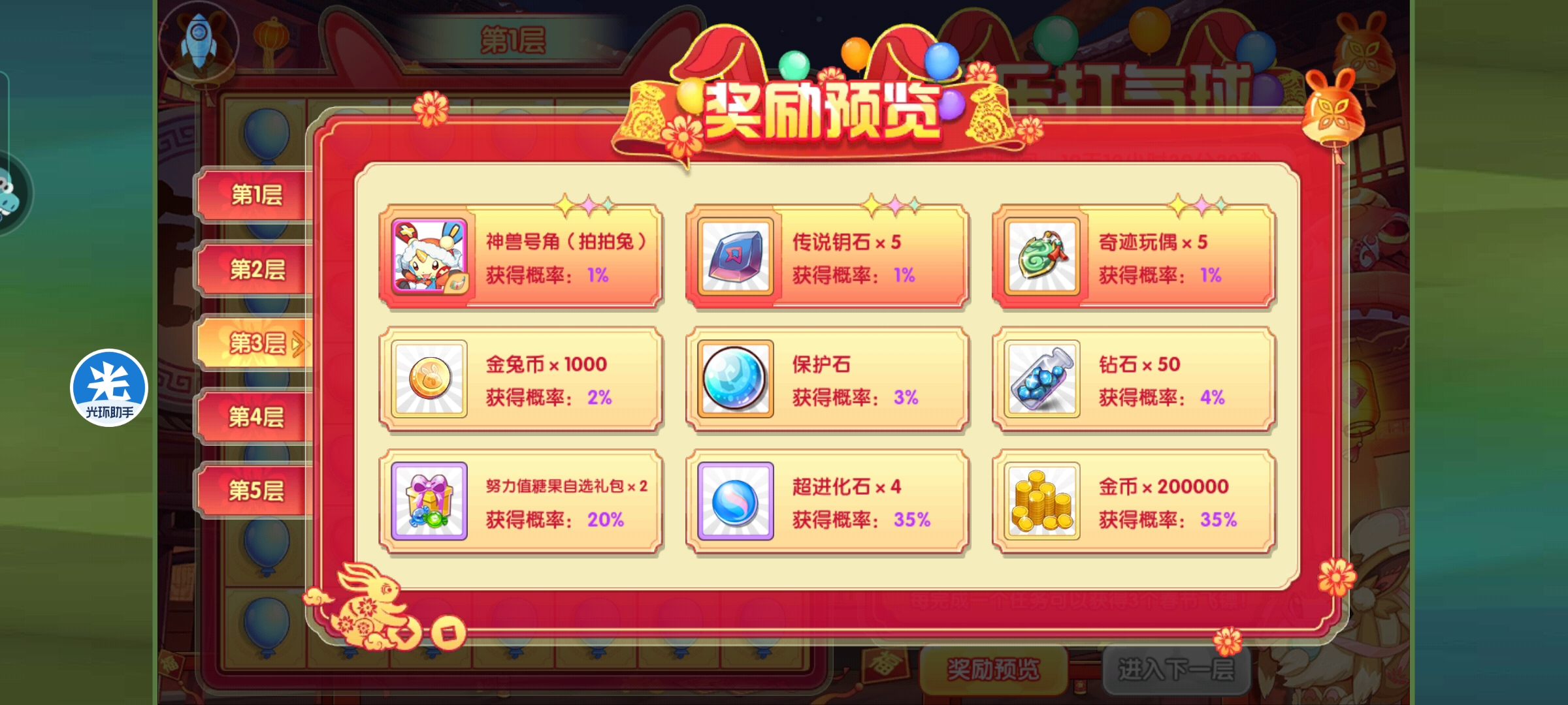 春节活动之欢乐打气球清风江明月发布于 2023-01-13关注炊示打气球这个活动挺简单的,就是毎天完成指定任务可以領取活动。 活动如图,就是每天联盟三次,王者一次,副本10次,精英副本五次,三次pvp,花钻石100,就可以领取所有春节飞镖。 必须先选择本轮想要得的奖励オ可以开始游戏。就是精华,石雕,结晶三个。 在本轮奖励之后,可以自由选择是否前往下一关。 奖励如图,每层都是随机获取的。这里材料都是完整的,不需要碎片合成。 年兽倔倔兔子和啪啪兔子也是这个副本获取,这个副本完全通关,可以获得两只年兽和5000的金兔币。