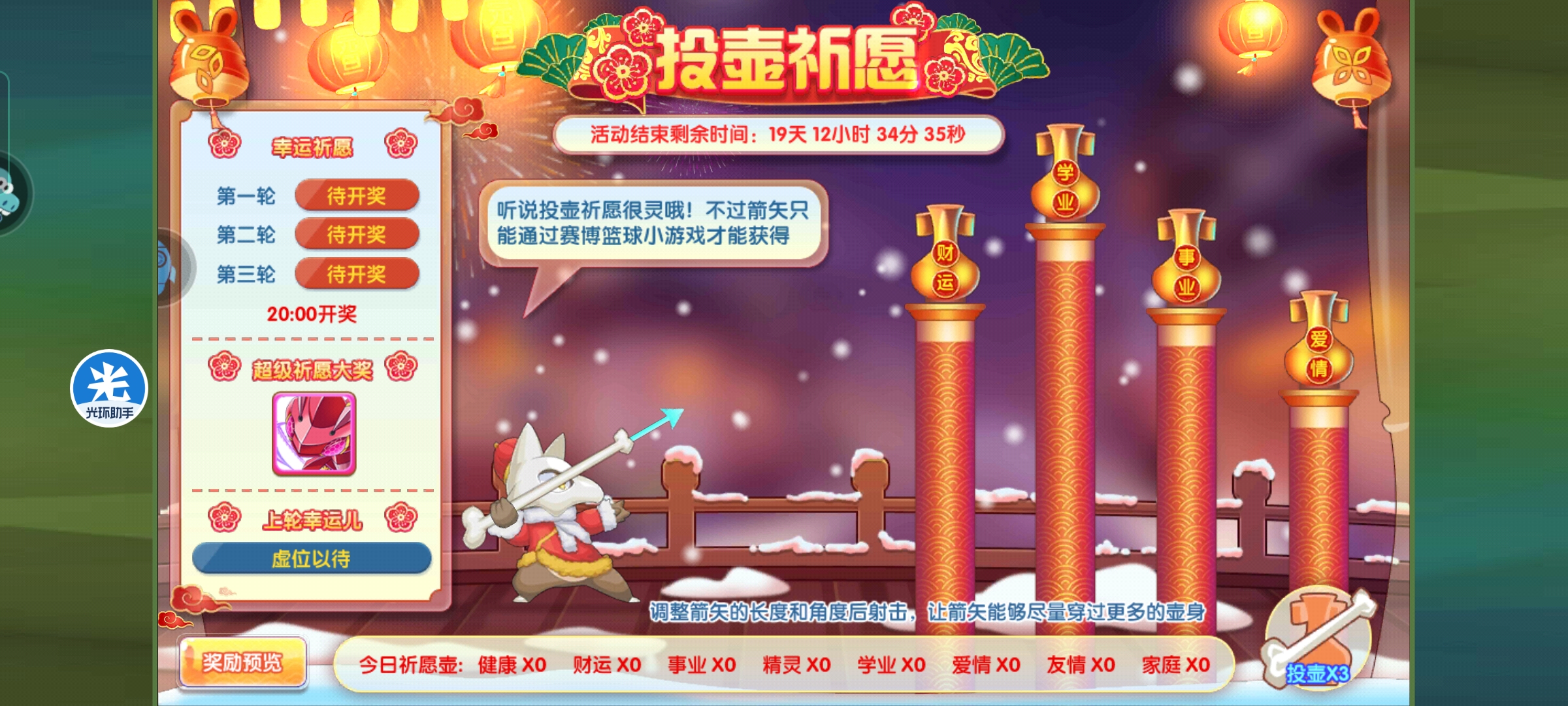 投壶祈愿的活动开启等级:是35级,每日可通过参与迎春大街春节活动的赛博篮球小游戏玩法,赢取祈愿箭矢。每天晚上20:00到21:00以外时间,可消耗祈愿箭矢参与投壶玩法。
