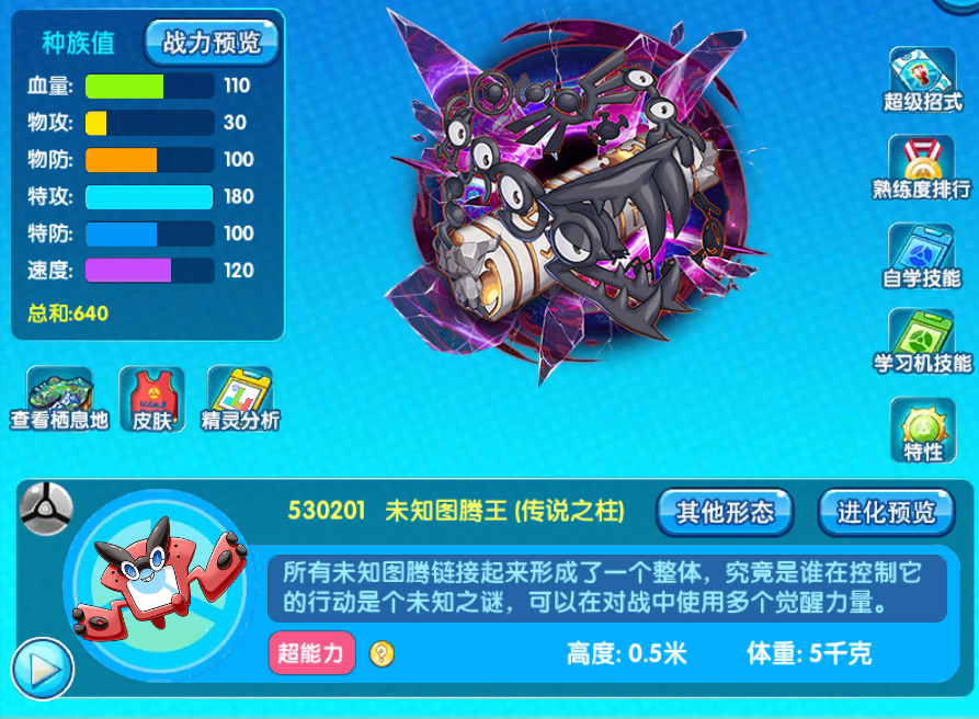 好了,言归正传,今天的主角并不是我介绍一只一只又一只的未知图腾,还是介绍他们的终极融合形态未知图腾王,那么这只宠物的强度怎么样呢?接下来就让我为大家介绍一下吧