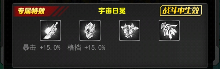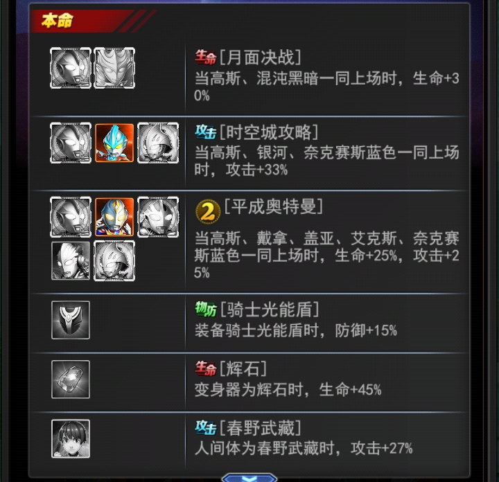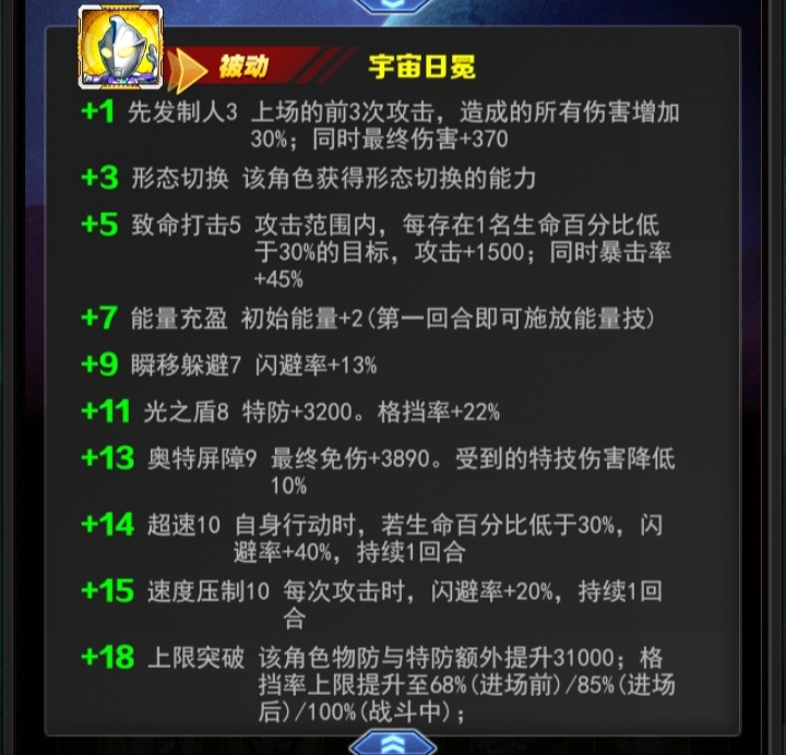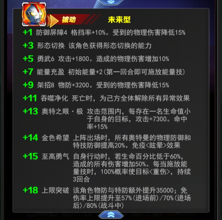 +14 金色希望上阵出场时,所有奥特曼的物理防御和特技防御提高20%。免疫<眩晕>效果