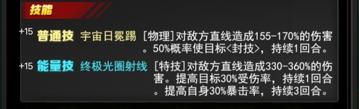 +15 能量技 高斯重击 [物理]对敌方单体造成550-600%的伤害。对敌方后排造成50%的伤害。提高敌方后排50%受伤率,持续1回合。