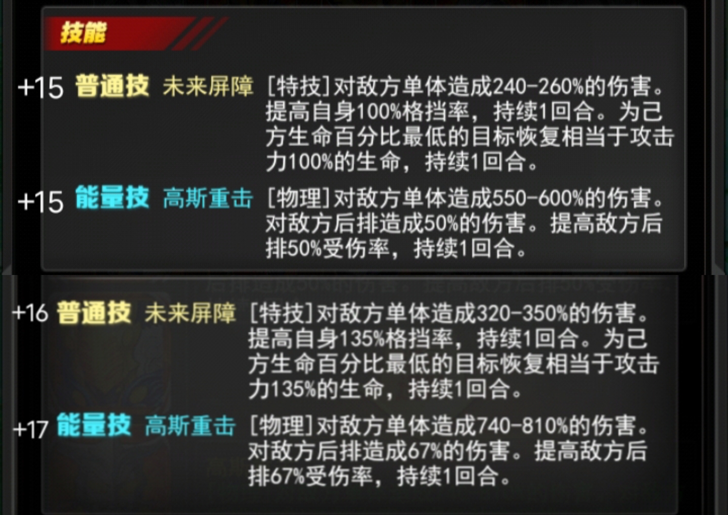 +17能量技 高斯重击 [物理]对敌方单体造成740-810%的伤害。对敌方后排造成67%的伤害。提高敌方后排67%受伤率,持续1回合。