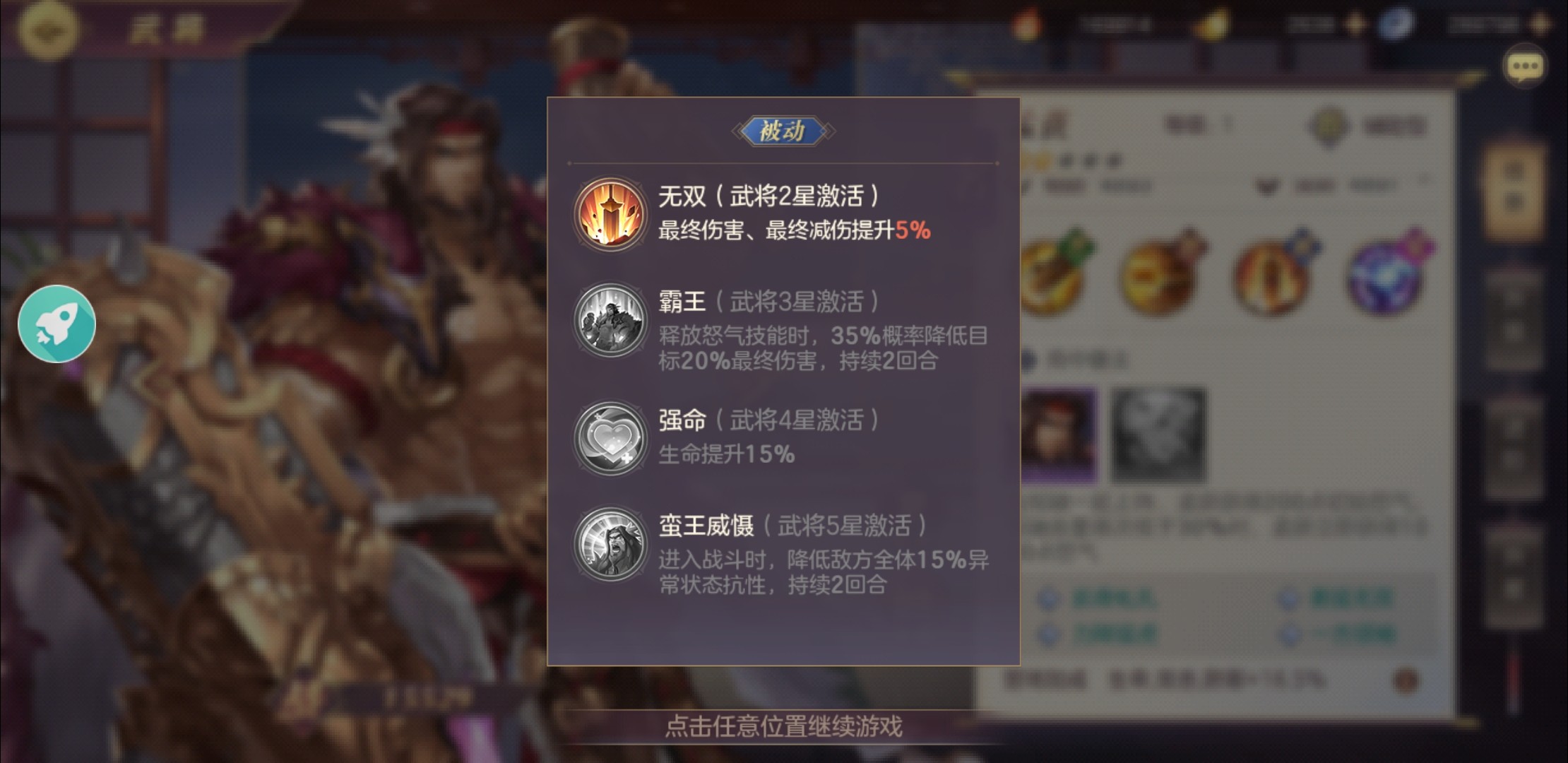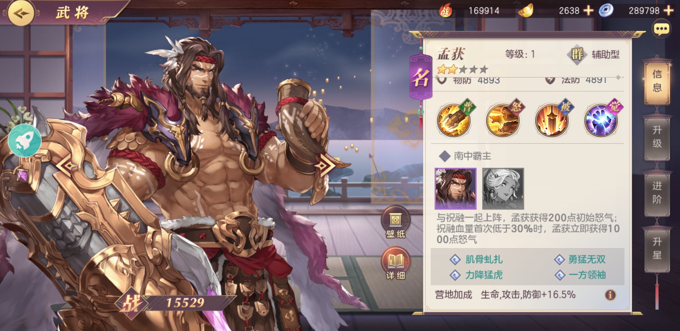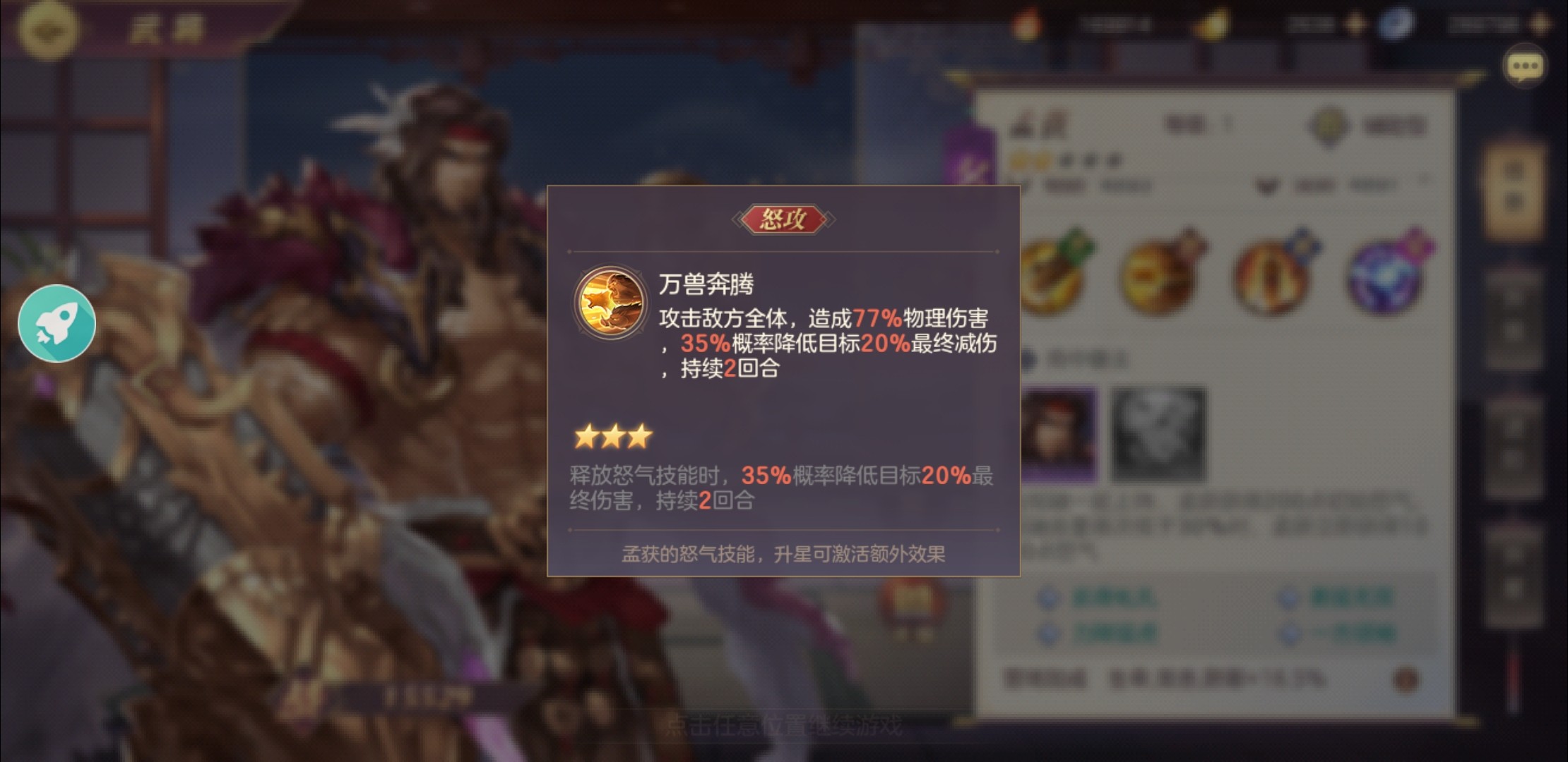 总的来说,孟获的基础机制非常的简单,也是一个比较实用的辅助武将。怒气技是对对方全体的一个降低防御,是性价比比较高的,他也是比较适合在队伍中充当一个辅助武将的位置,能提供很不错的Buff和减益效果~~