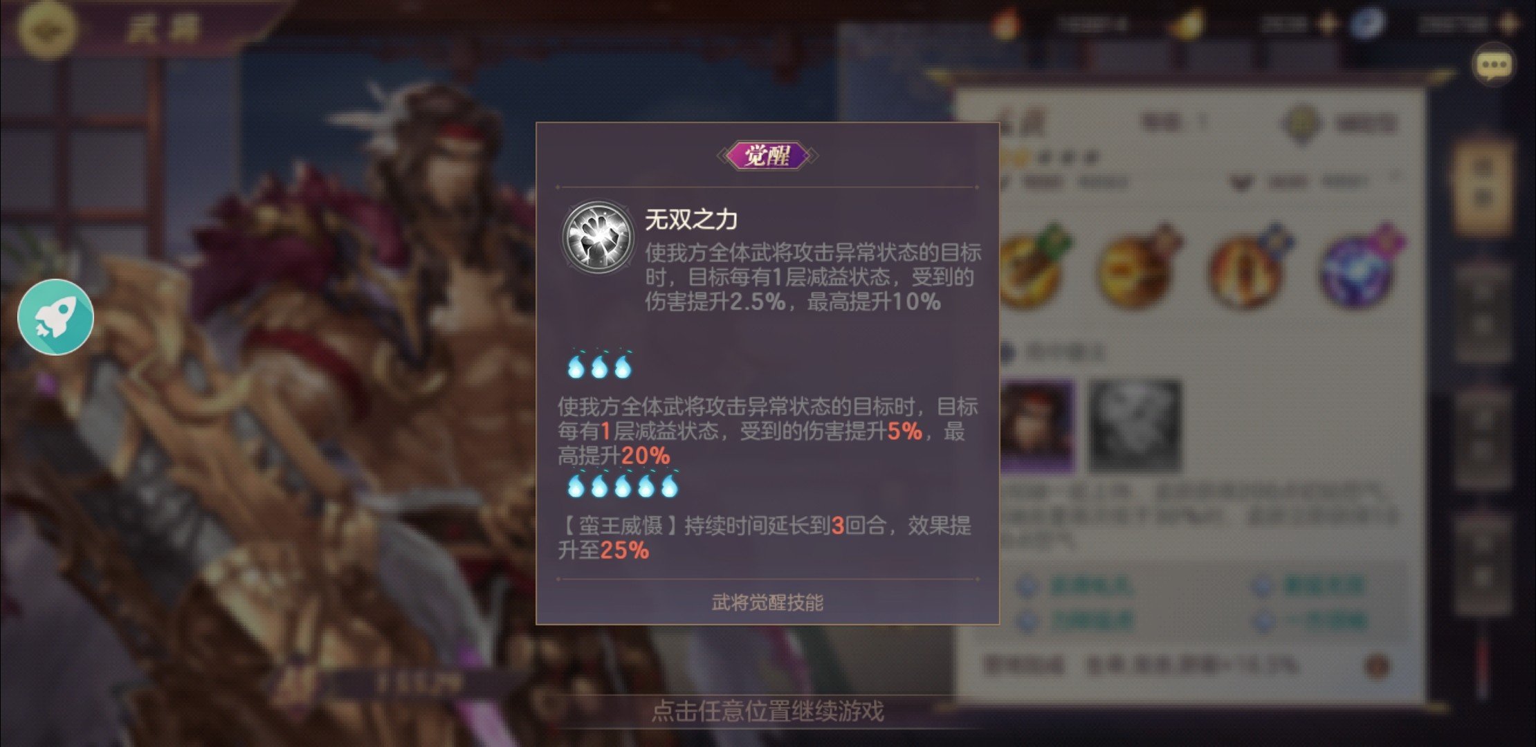 三星新增机制:释放怒气技能时,35%几率降低敌方20%的最终伤害加成,持续两回合。这个也是性价比很高的一个控制,而且是让孟获的控制能力增长了一倍吧。让他成为了一个纯纯的控制武将,没有任何其他的东西。我觉得这种成长对于一个辅助武将来说是很棒的,而且对于队伍的整体实力成长也有不小的帮助。