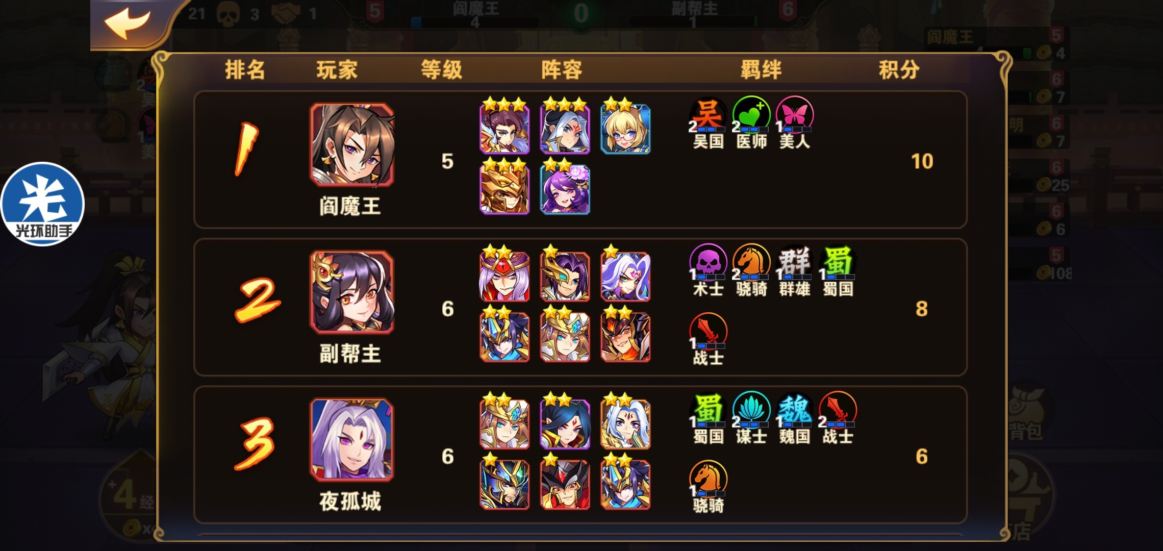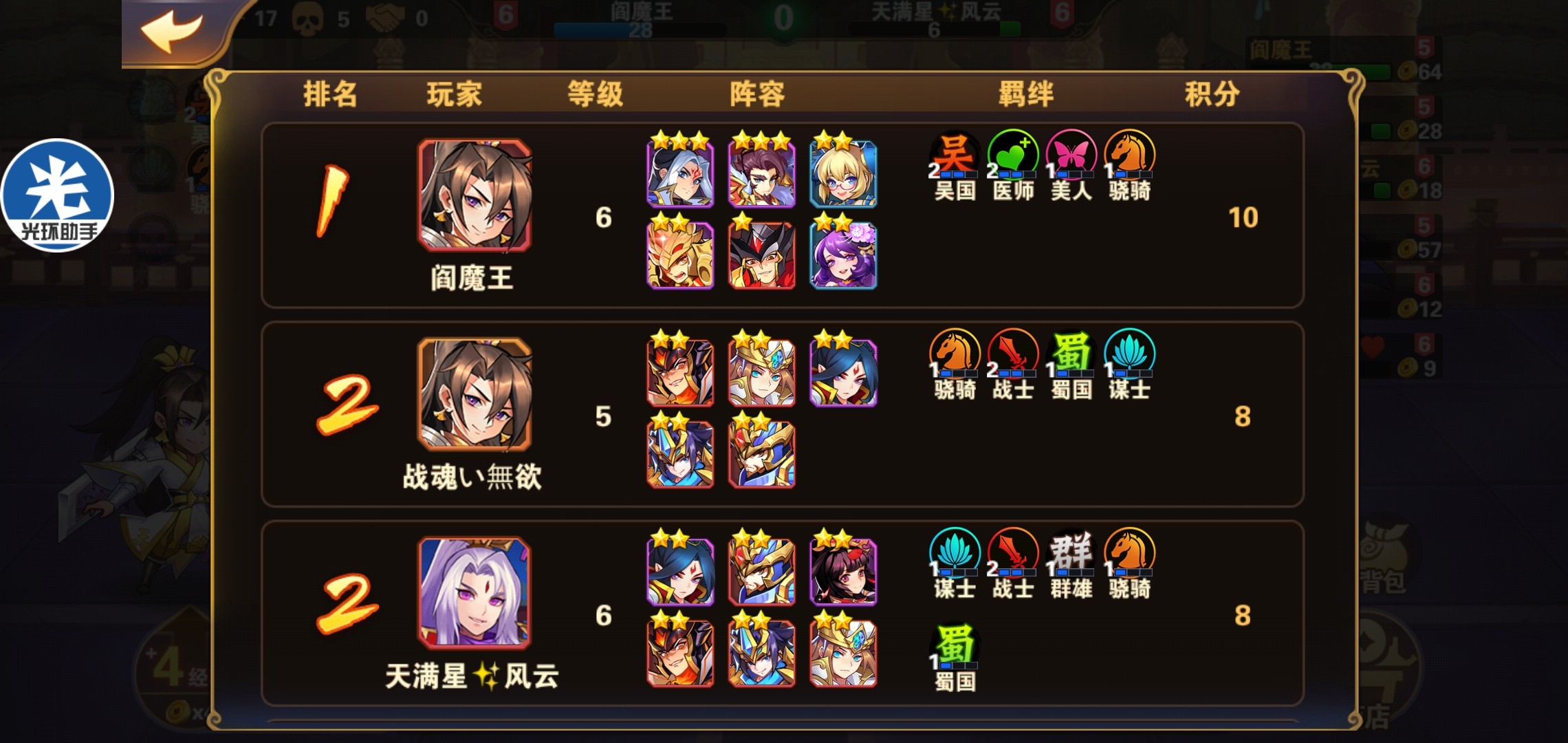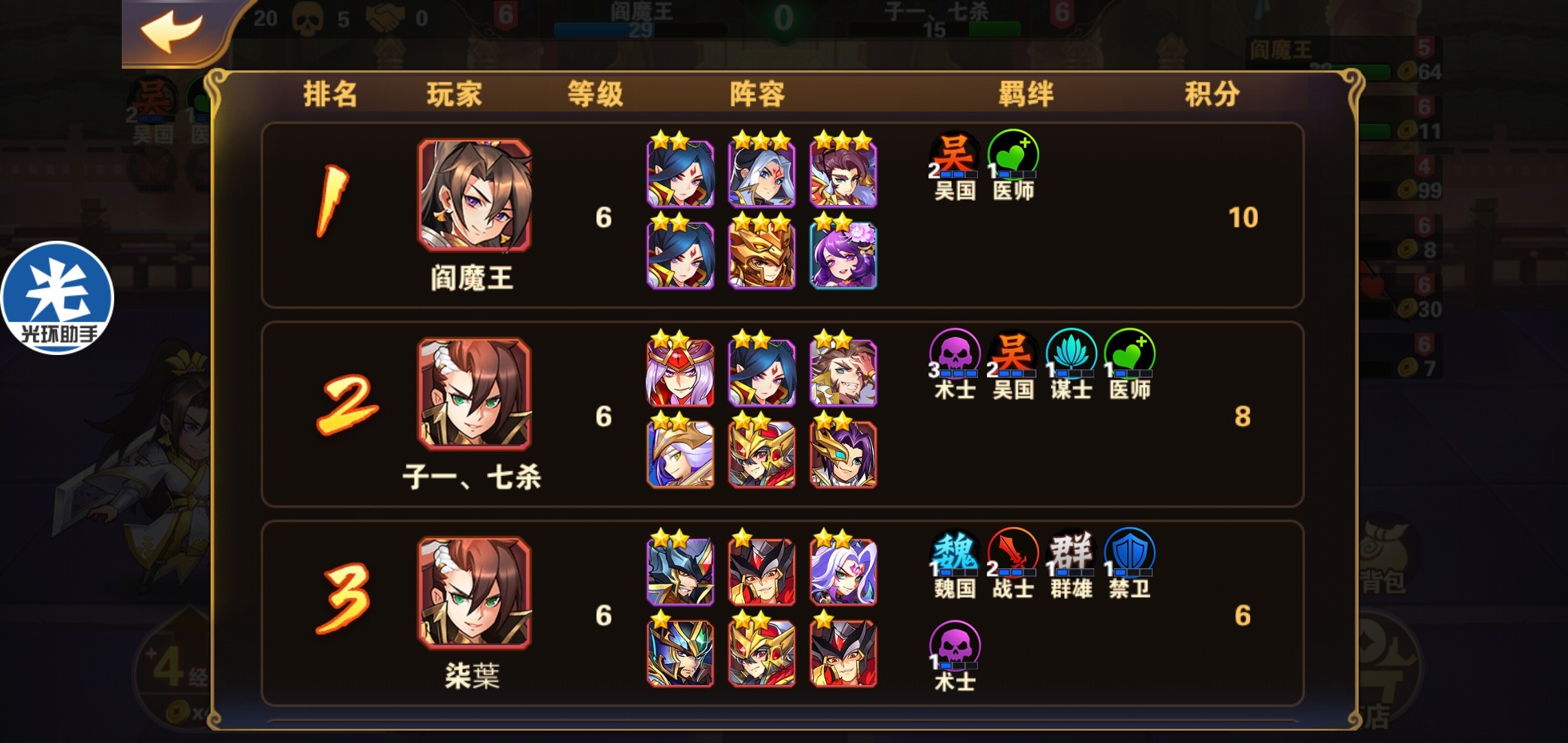 6级占位:保证太史慈,孙权,陆逊都3星,占位还是陆逊1,孙权2,吕布3,太史慈4,大乔6。备选:2星陆逊,2星菜菜,2星吕布在3.5位