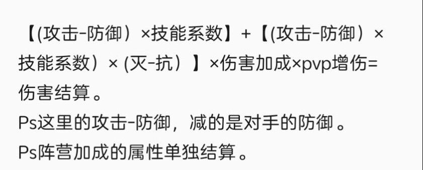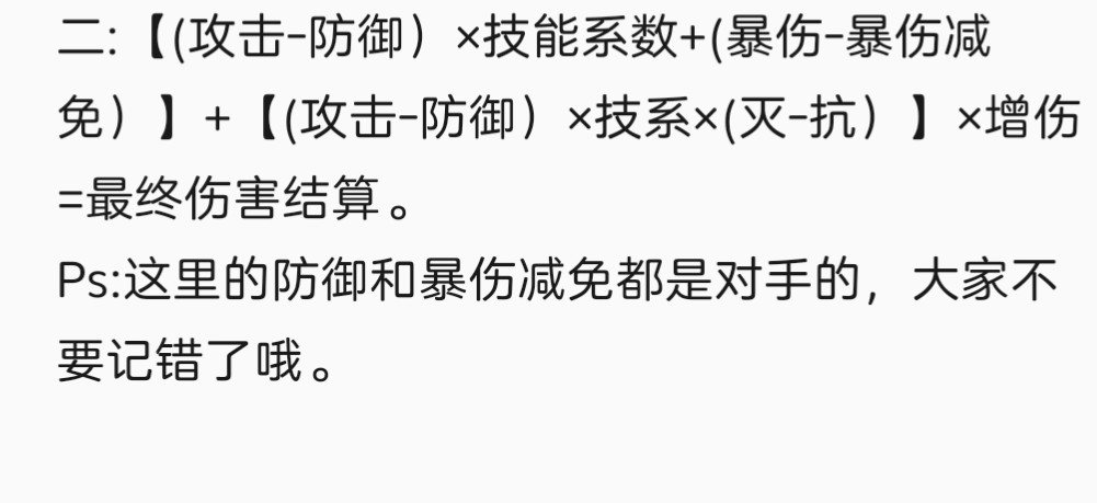 二:【(攻击-防御)×技能系数+(暴伤-暴伤减免)】+【(攻击-防御)×技系×灭-抗】× 伤害加成=最终伤害结算。(为了方便大家观看,我用图片来列出来)