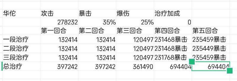 我们把公式代入华佗的数据中得下以下结论,由于治疗受单体影响和实战影响,会有一点浮动。大约5%左右