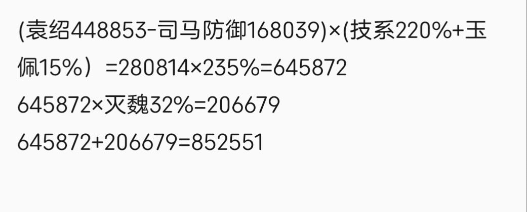 *×(技能系数175%+玉佩技能15%)=*+(*×灭群73%-抗魏29%)=*(伤害区间)。阵营加成得单独算。