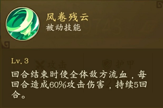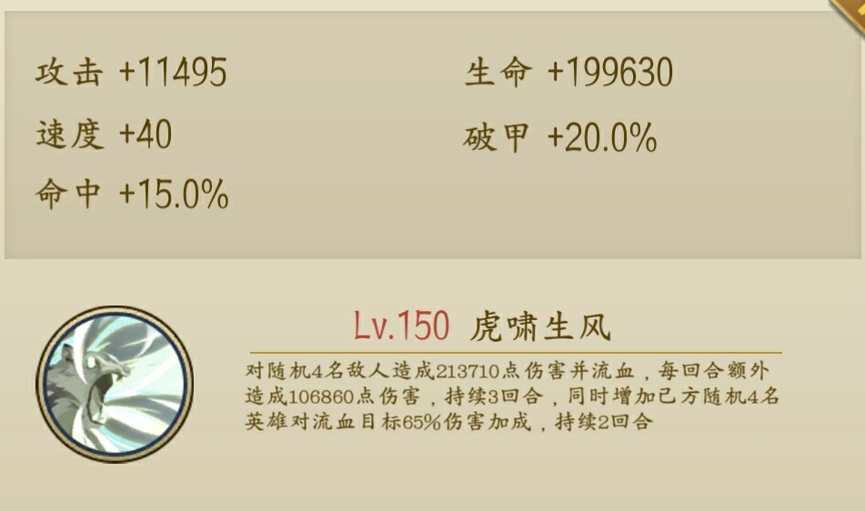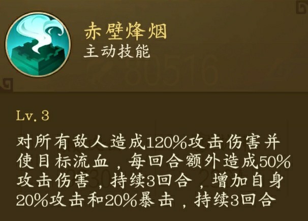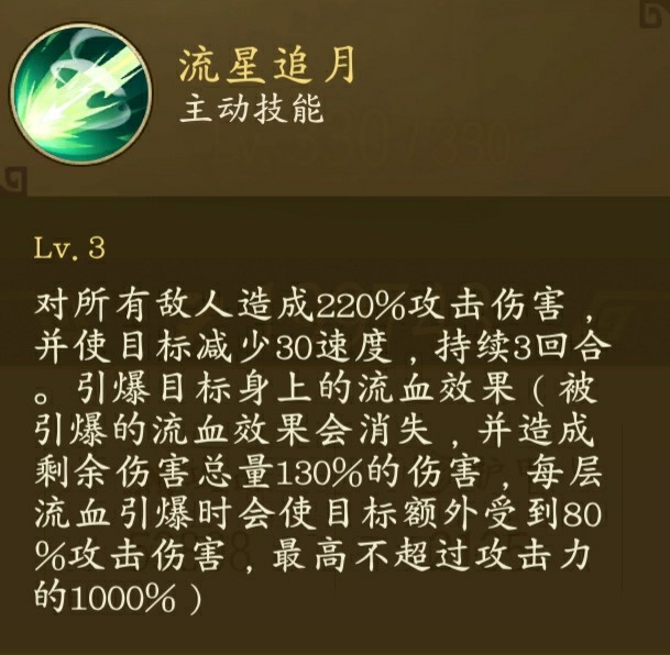 她的大招可以对敌方全体造成攻击伤害并使他们的速度减少30持续三回合,此外还会引爆目标身上的流血效果,可能有的小伙伴看不懂那130%的伤害到底是什么乘以130%那我就来详细的说一下,假如你对敌方的流血伤害是回合造成5000点伤害持续三回合,那么你在第二个回合引爆的时候,他身上的流血效果还有两个回合,这时候引爆所造成的伤害就是5000x2x130%=13000