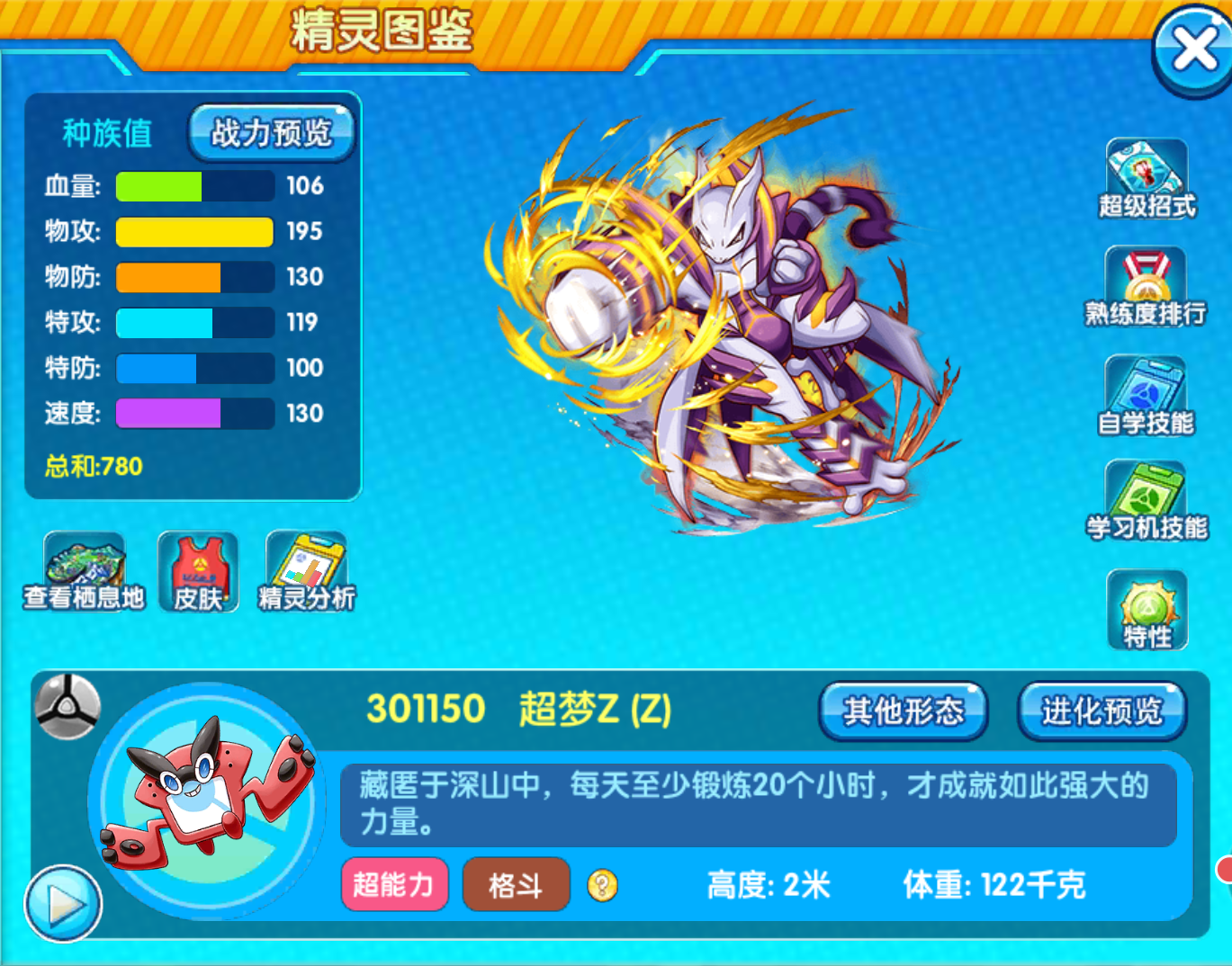 基因和梦幻几乎一样,但是大小和性格迥异到可怕。出于研究目的不断重组基因,结果变成凶暴的宝可梦。超梦是以母本梦幻加以改造并克隆得来的事实。超梦属于超能力系,通过精神干扰实现飞行,也可以通过读心术实现与人的对话。在战斗时,超梦可以利用其超能力的本能建立护罩,或将精神攻击掷向对手。超梦具有很强的自我再生能力,能够迅速地从濒死状态恢复过来。