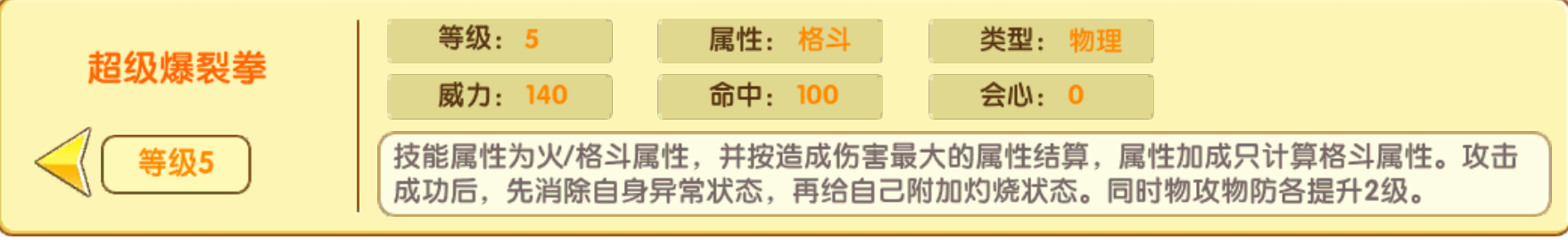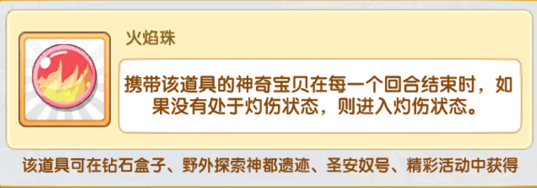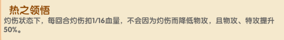 灼烧状态下,每回合灼烧扣1/16血量,不会因为灼烧而降低物攻,且物攻,特攻提升50%。【你可以选择携带物携带:火焰珠】