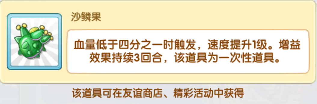 因为他的速度比较低,被对面快一点的打残血后,容易被再打一次而濒死,所以建议携带沙鳞果扭转局势: