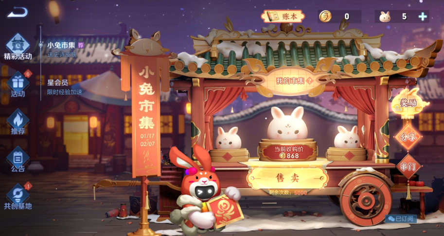 没错,就是游戏内的【小兔市集活动】! 出售小兔糕获得的小兔币可以换取史诗皮肤哦,希望新年大家都收获满满哒~