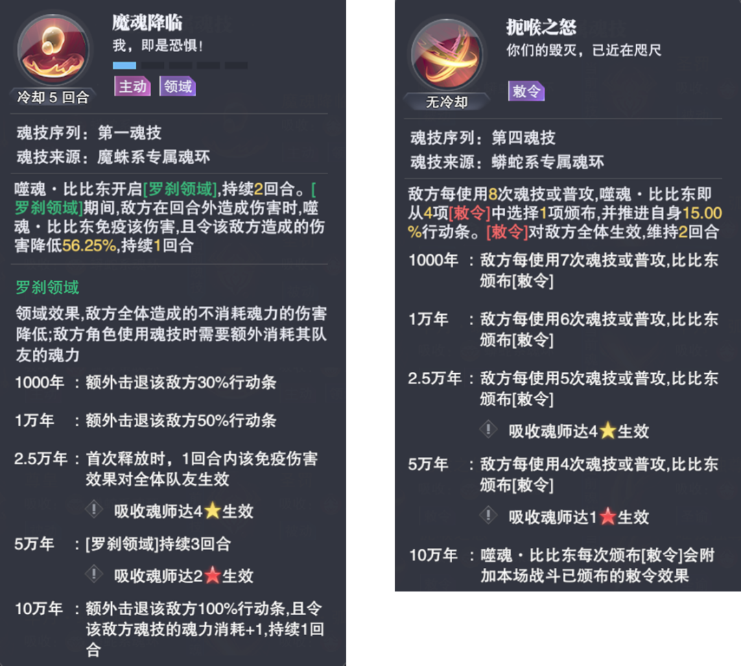 接着4-1技能相当于就是对方只要行动4-8次,比比东就可以群体给对方施加1项debuff,特别是这个禁被动和禁拉条的效果,真心有点过分了,关键这玩意还是群体生效的,并且当你的比比东达到红色4星后,战斗中后期每次颁布赦令都相当于同时颁布4项,限制能力估计大家都不用实战了,脑补一下都能想象其恐怖,所以在未来的PVP战斗中,大家只要有SP比比东,几乎就是必上的,和海魔女一起配合即可。