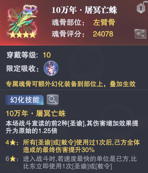 最后SP比比东的左臂专属魂骨,大家最好给升到保底4星再上,这样也能非常可观的提升我们的长图伤害,另外这也是为何长图战斗开始时,我们需要优先锁定两个最终伤害提升圣谕的原因所在。