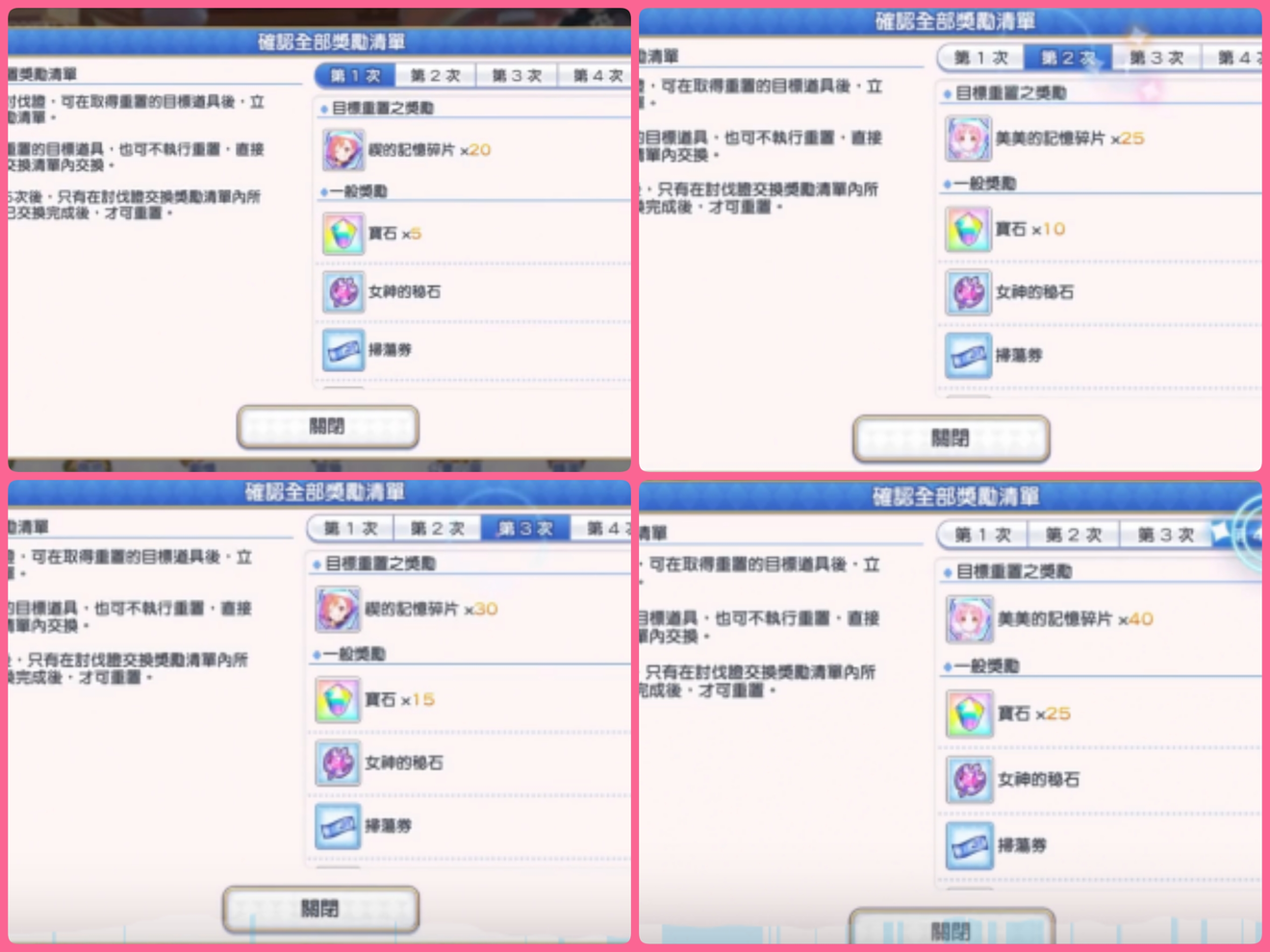仅有前四箱有记忆碎片,从第五箱开始的报酬中将没有记忆碎片。其中未奏希碎片2池,美美的2池。前四箱在抽到全部记忆碎片后可以选择重置,直接进入下一箱的抽取(个人不太推荐重置,正常前四个箱子算比较好的了)。