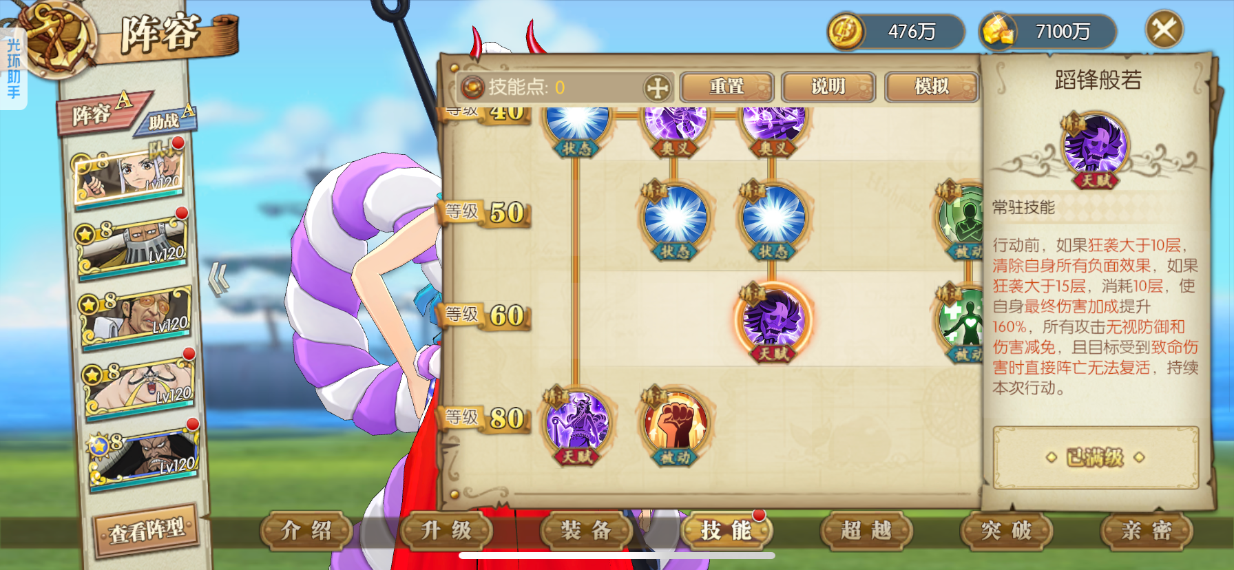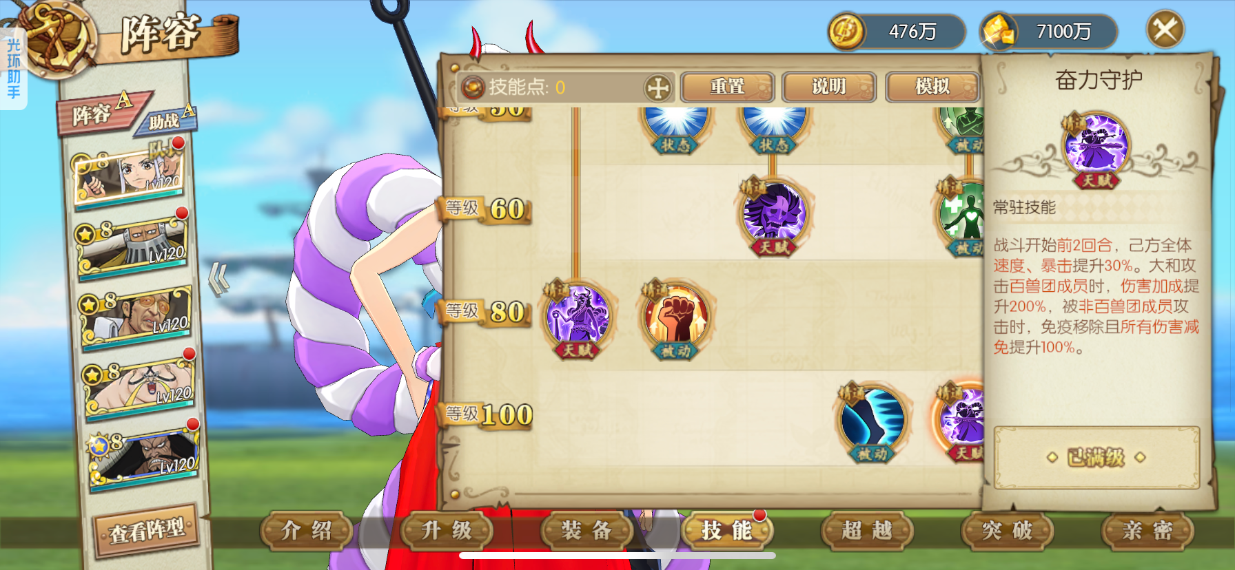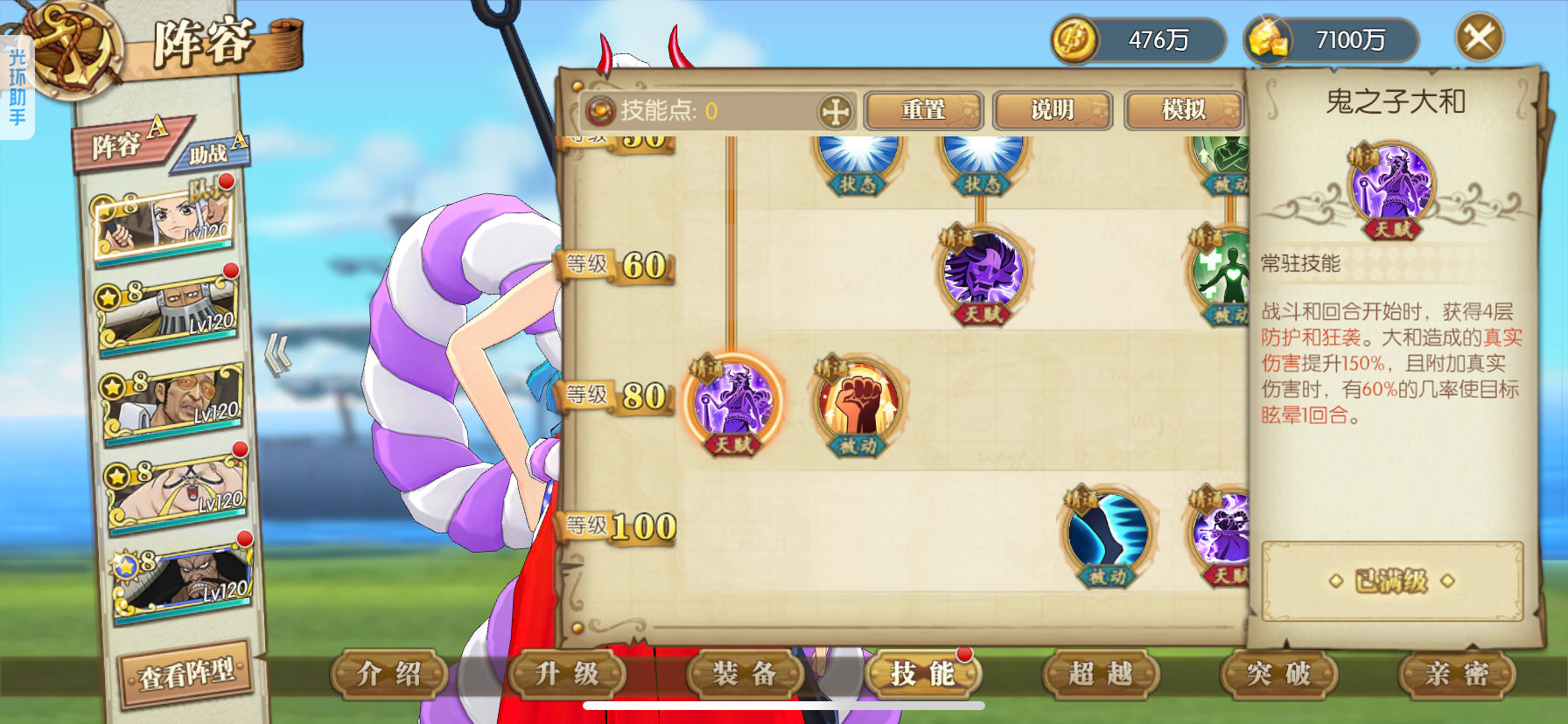 天赋说明:战斗开始前2回合,己方全体速度、暴击提升。大和攻击百兽海盗团成员时,伤害加成提升,被非百兽海盗团成员攻击时,免疫移除且所有伤害减免提升。