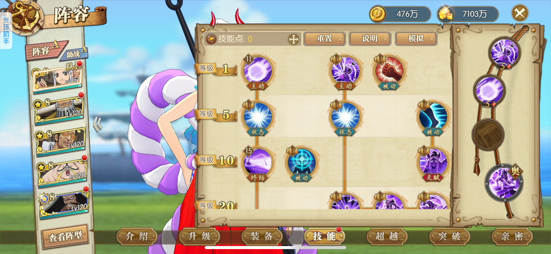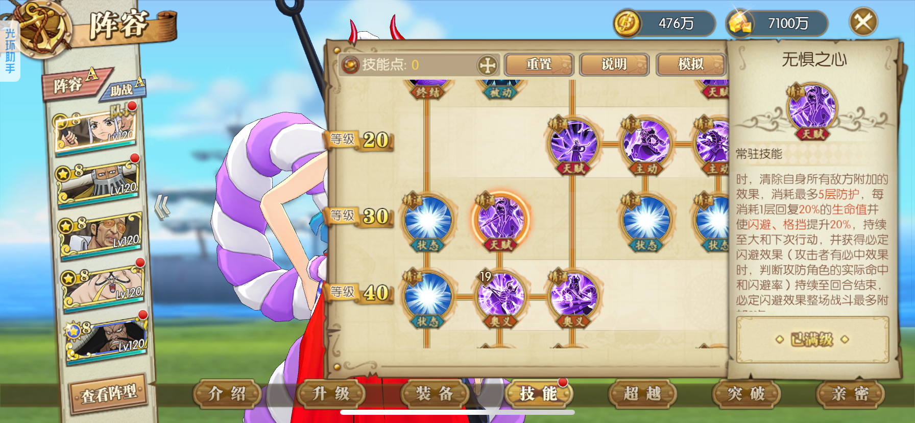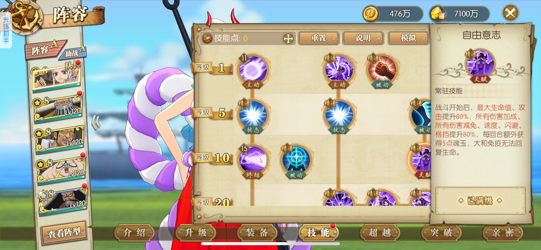 天赋说明:战斗开始前2回合,己方全体速度、暴击提升。大和攻击百兽海盗团成员时,伤害加成提升,被非百兽海盗团成员攻击时,免疫移除且所有伤害减免提升。