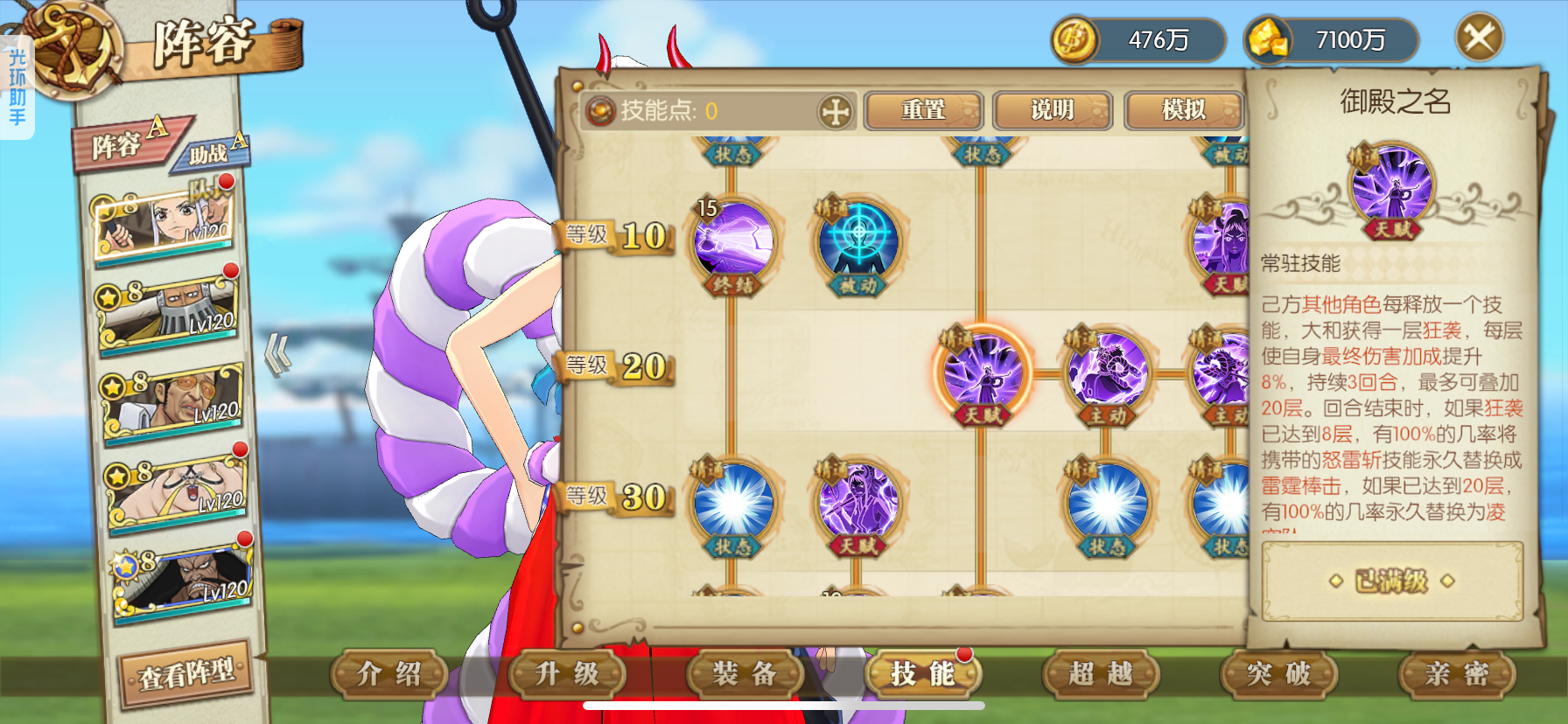 天赋说明:己方其他角色每释放一个技能,大和获得一层狂袭,每层使自身最终伤害加成提升8%,持续3回合,最多可叠加20层。回合结束时,如果狂袭已达到8层,将携带的怒雷斩技能永久替换成雷霆棒击,如果已达到20层,有100%永久替换为凌空坠。