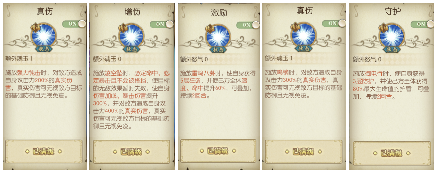 天赋说明:战斗开始后,最大生命值、攻击提升80%,所有伤害加成、所有伤害减免、速度、闪避、格挡提升80%,每回合额外获得5魂玉,大和免疫无法回复生命。