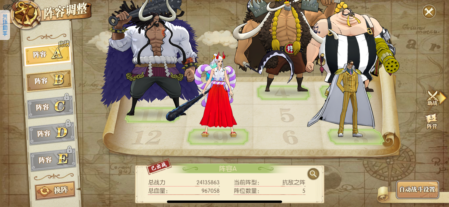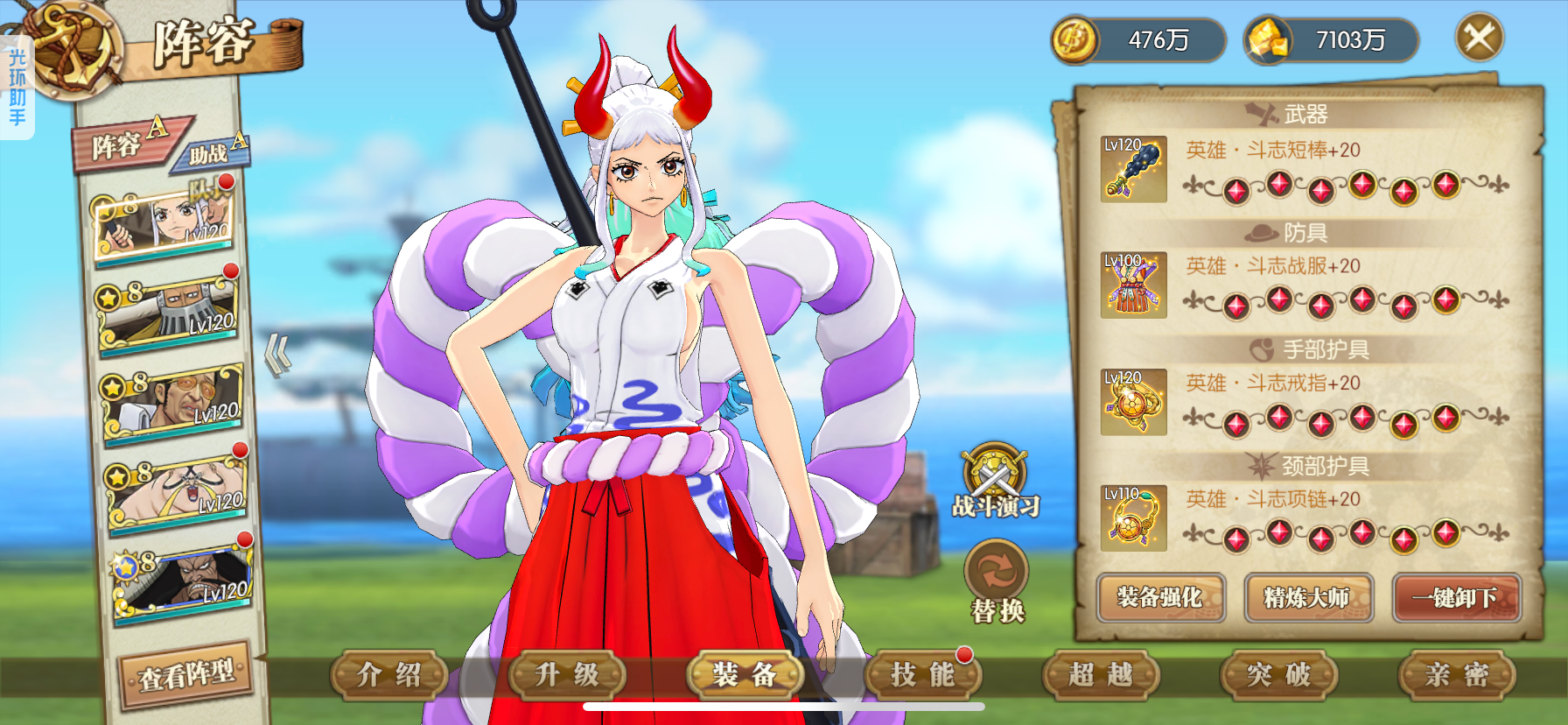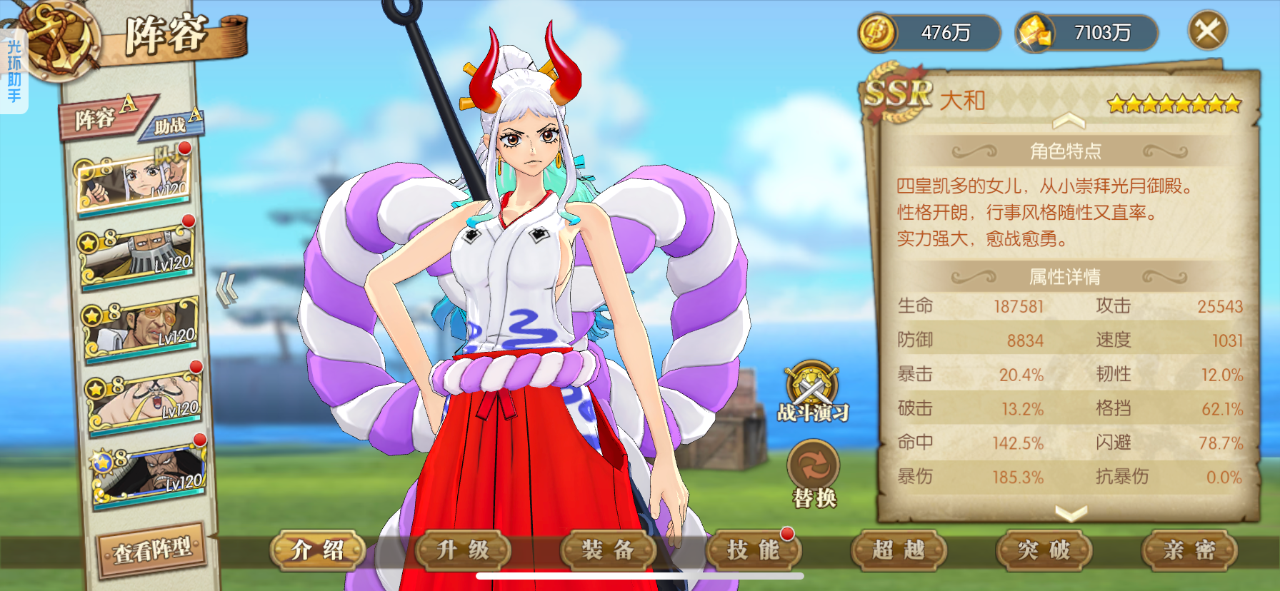 大和玩法简单,刚觉醒完的大熊面对大和叠满15层狂袭被动的效果是直接噶了。大和目前版本是十分变态,输出克制复活与无敌人物,造成能打得动大和只有高速高命中的凯多与大和,而凯多更多是走2+2的玩法。天梯最佳搭配觉醒人物是老沙、雷神、黄猿进行阵容克制。