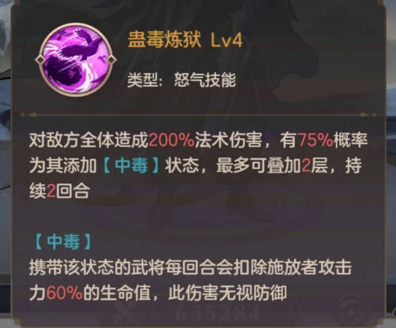 贾诩怒气技能蛊毒炼狱,对全体造成大量的法术伤害,有75%的慨率添加中毒状态。毒状态可以叠加2层,每回合可以受到贾诩的60%的生命值的伤害,这就是为什么很多人玩贾诩走肉,因为贾诩的中毒伤害和生命息息相关,并且贾诩的中毒效果是无视防御,同时贾诩的中毒可以叠加2层。相当于每回合受到贾诩120%的生命值的中毒效果。生命的基础数加成远高于攻击,所以这也是贾诩比袁术的毒厉害的原因之一。唯一缺点就是可以被净化。
