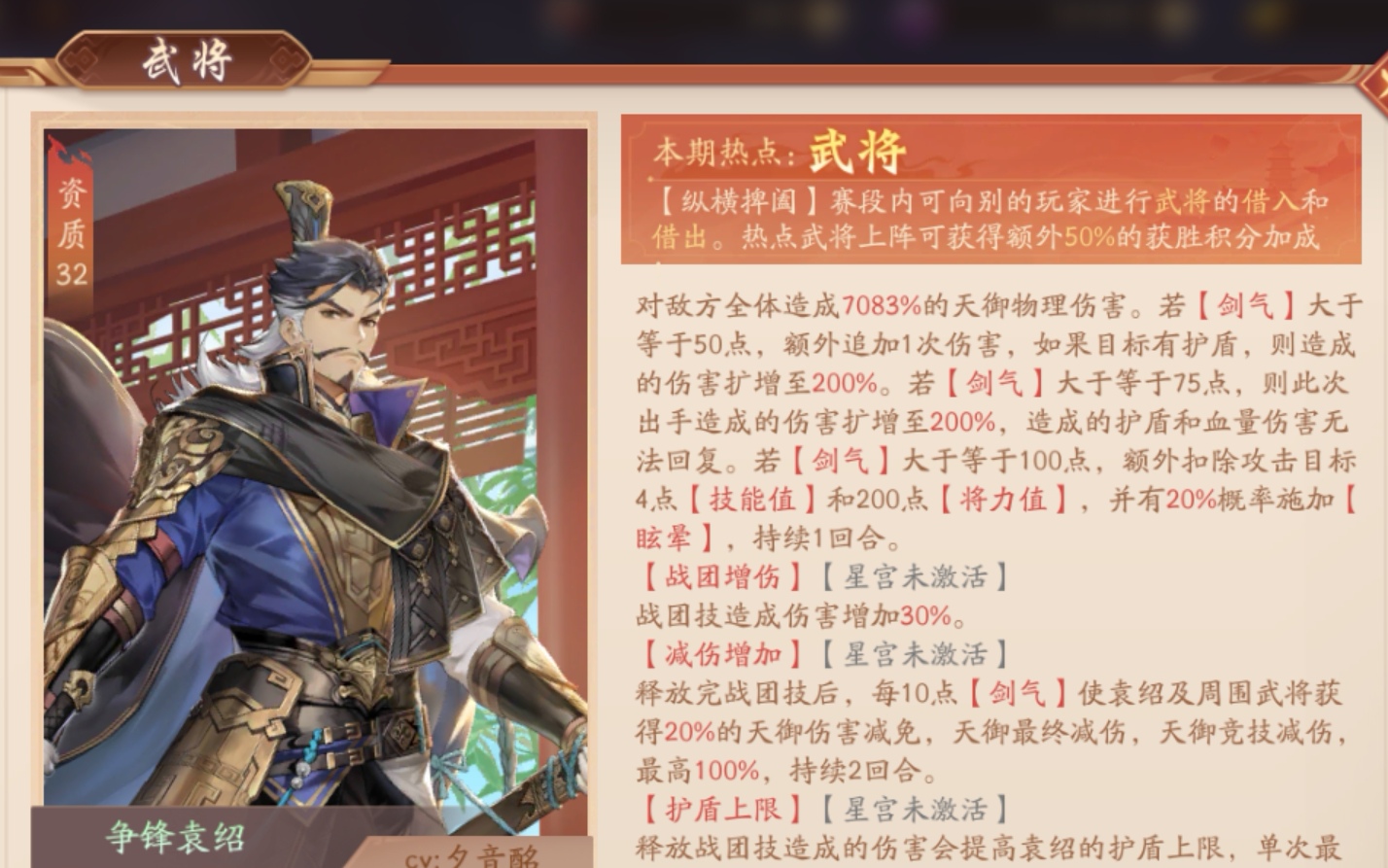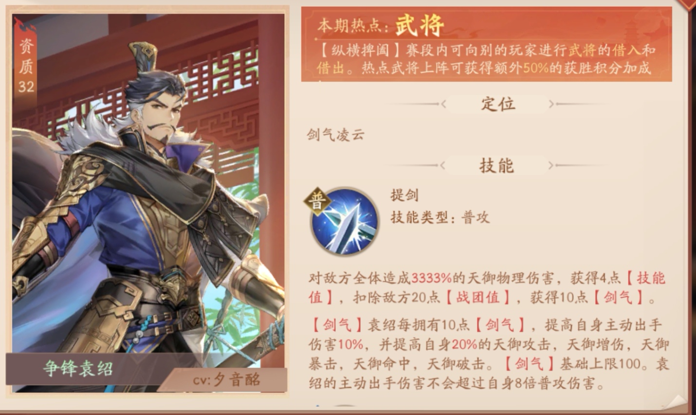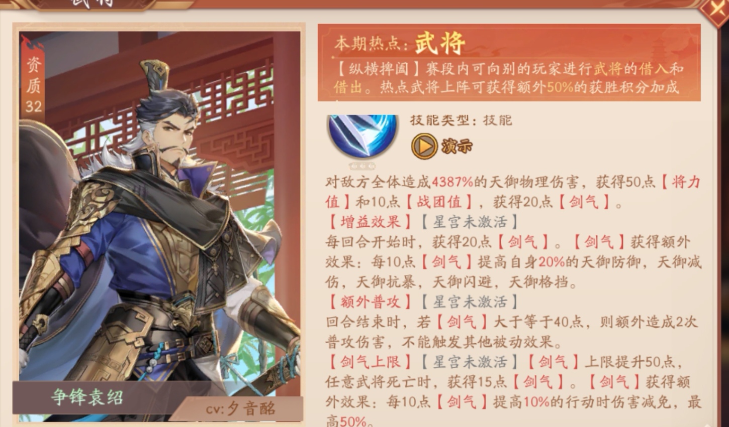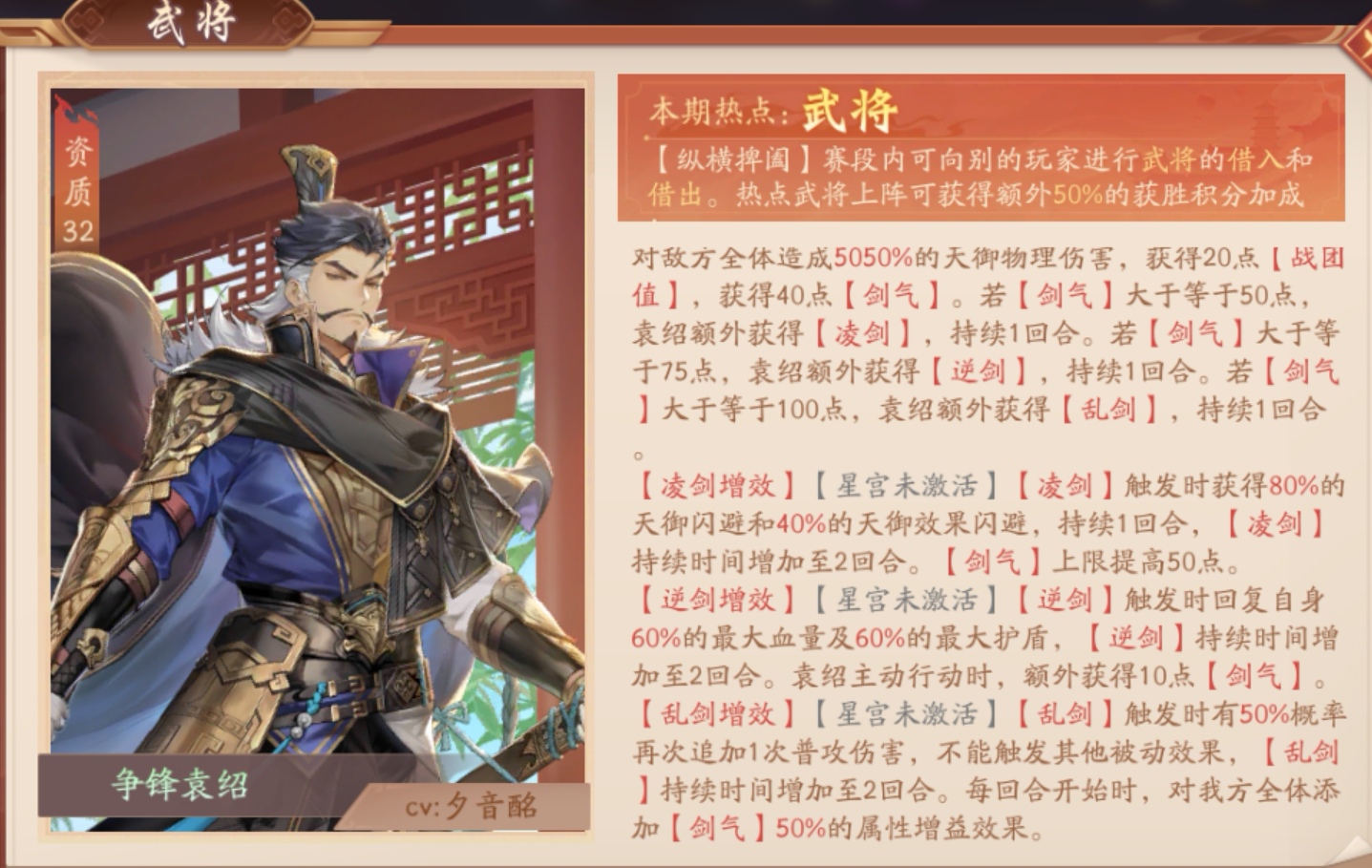 核心:剑气(每拥有十点剑气,提高自身主动出手伤害10%,提高自身20%天御攻击、增伤、暴击、命中、破击,剑气上限100,袁绍主动出手伤害不超过自身8倍普攻)