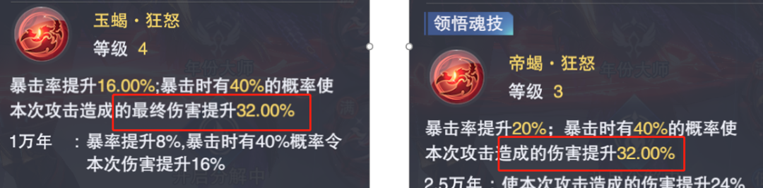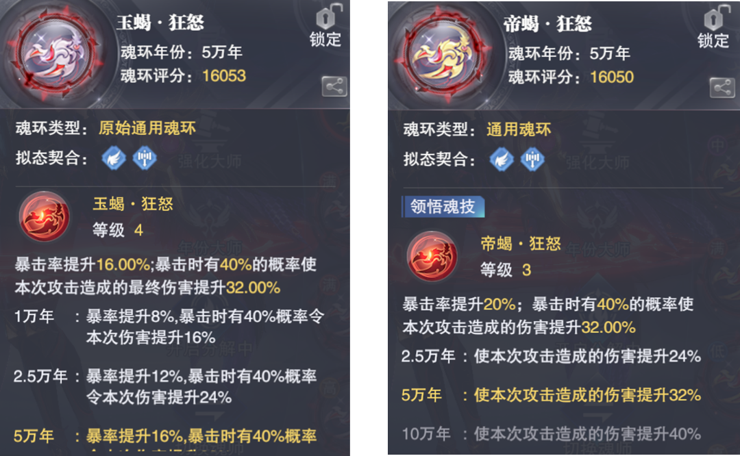 经过维一的多次实测,在佩戴类似【玉蝎·狂怒】和【帝蝎·狂怒】魂环的前提下,其在触发40%效果后的实际伤害也极为类似,因此维一认为这两个魂环的效果应该是一致的,只是因为官方的描述原因而让部分玩家产生的误解。