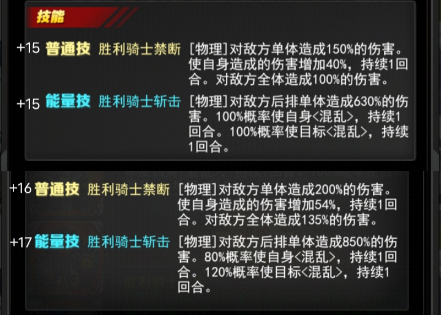 +17能量技 胜利骑士斩击[物理]对敌方后排单体造成850%的伤害。80%概率使自身<混乱>,持续1回合。120%概率使目标<混乱>,持续1回合。