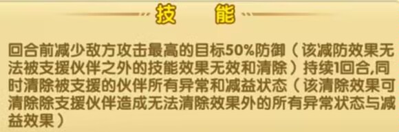 1、原文:回合前减少敌方攻击最高的目标50%防御(该减防效果无法被支援伙伴之外的技能效果无效和清除)持续1回合