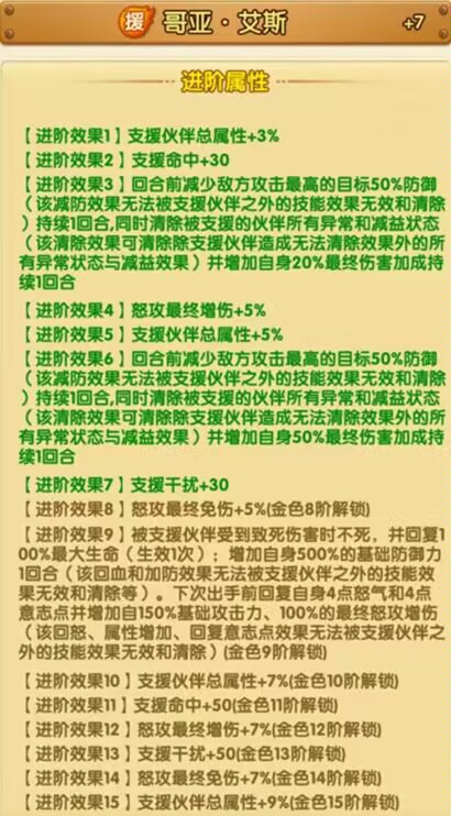 3、原文:(进阶9)被支援伙伴受到致死伤害时不死,并回复100%最大生命(生效1次) ;增加自身500%的基础防御力1回合(该回血和加防效果无法被支援伙伴之外的技能效果无效和清除等)。下次出手前回复自身4点怒气和4点意志点并增加自150%基础攻击力、100%的最终怒攻增伤(该回怒、属性增加、回复意志点效果无法被支援伙伴之外的技能效果无效和清除)