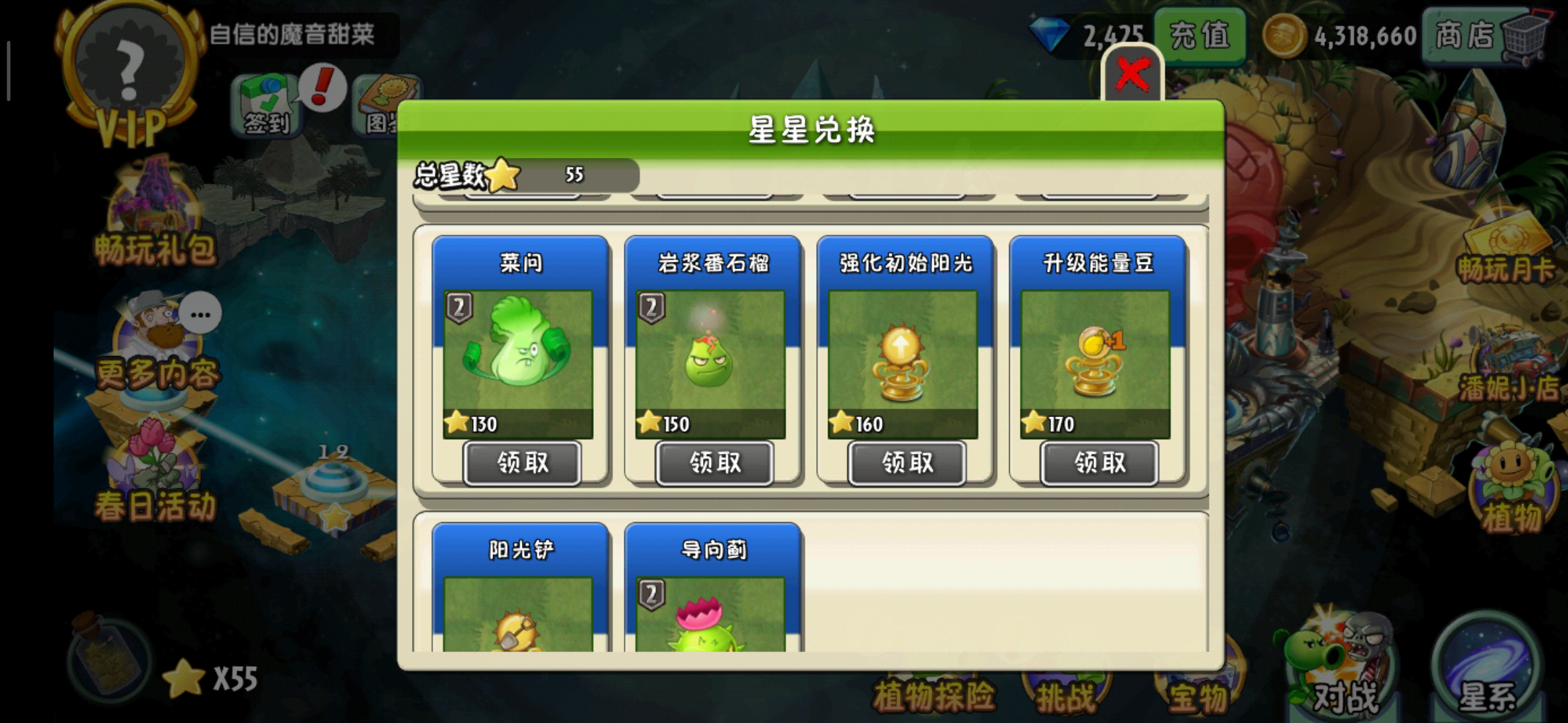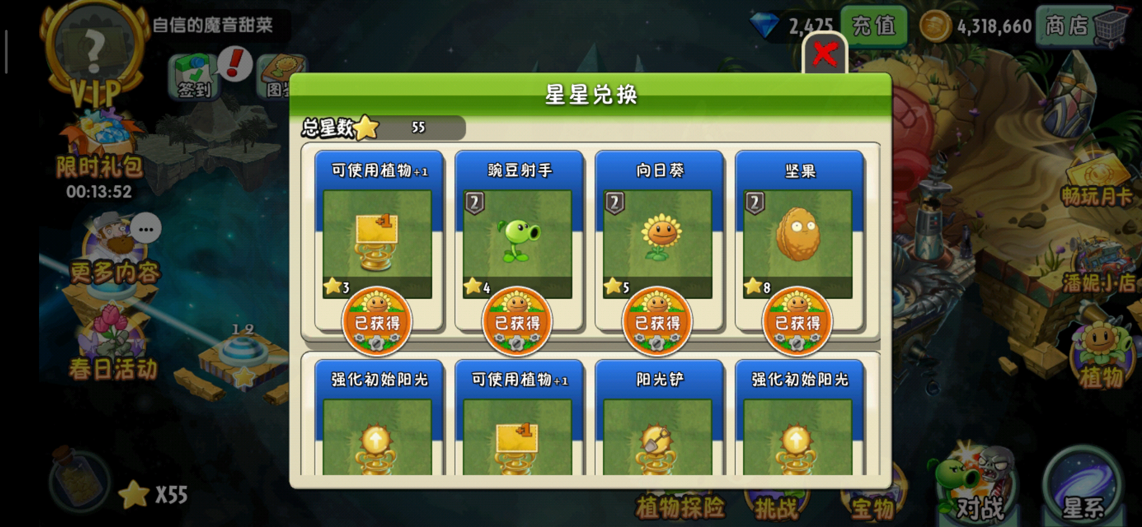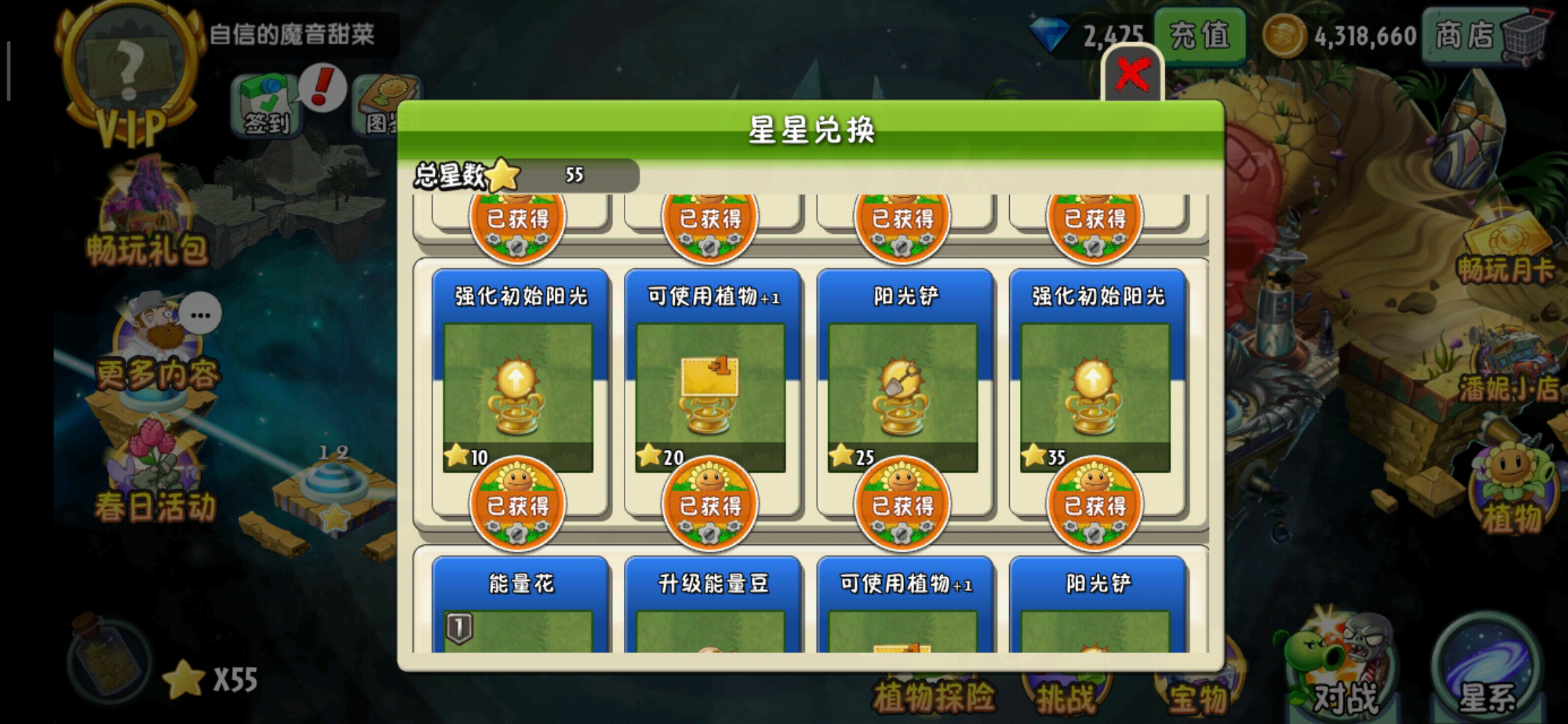 之前也说过了,这四个奖励是可以多次获得的,只不过每再一次有获得条件都会增加很多。当然,除了这四个效果很强的奖励之外,玩家还能在星星兑换中获得植物,比如说玩家最常用的豌豆射手,坚果,还有向日葵,当然这一些也是可以在获得更多星星之后进行升级的。