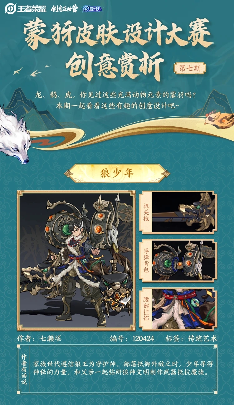 伽罗新皮肤正式上线!听说蒙犽还有动物元素的衣服设计?王者小助手@发布于 2023-02-05关注 妲己宝宝今天还带来了新一期蒙犽皮肤设计大赛创意赏析与动物元素相结合的蒙犽会是什么样子呢?快来一起看看叭~蒙犽皮肤设计大赛第7期创意赏析狼、龙、兔、猴,你能想象到这些动物元素和蒙犽结合,会有什么新奇的感觉呢?妲己宝宝在此为大家献上蒙犽皮肤设计大赛第7期创意赏析,一起来欣赏下这些精彩的作品吧! 蒙犽与这些小动物碰撞出的火花,让妲己宝宝感觉看了一场精彩的自然时装秀!跟本宝宝同感的小伙伴请举手~