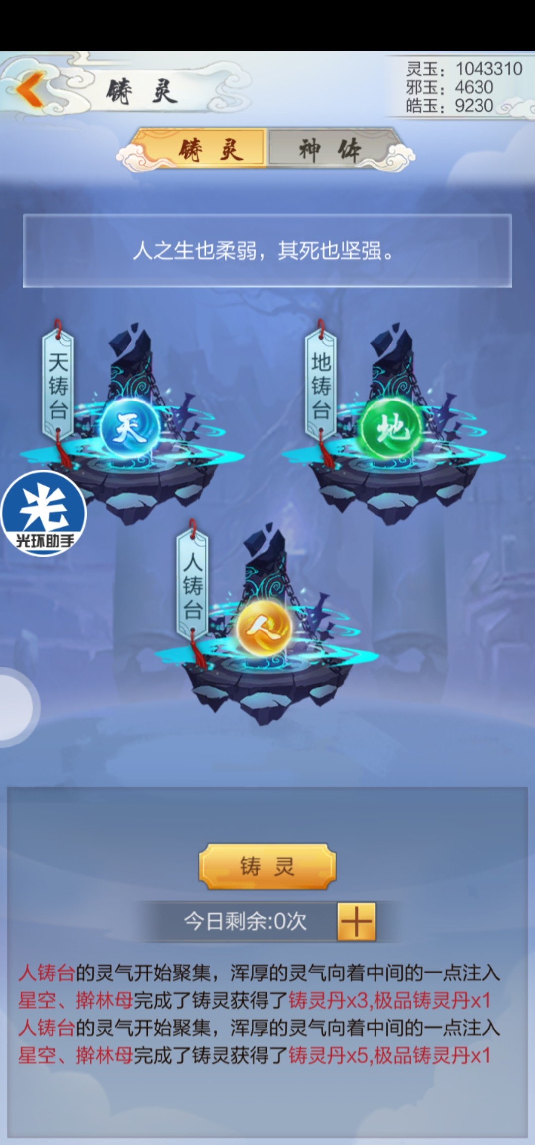 铸灵台:飞升后道友如果飞升前没有点过肉身,建议道友将肉身点到锻骨一(如果境界还没有游仙,肉身就先点到炼气),然后看铸灵台横幅,正常来说邪气正气到一定量会赠与道友邪玉皓玉,所以如果是寒蝉凄切……点地灵台铸灵2次,人之生也柔弱……就点人灵台,日上……是灵玉,刚上来的玩家我记得不会有灵玉,所以随机选一个铸灵台用。