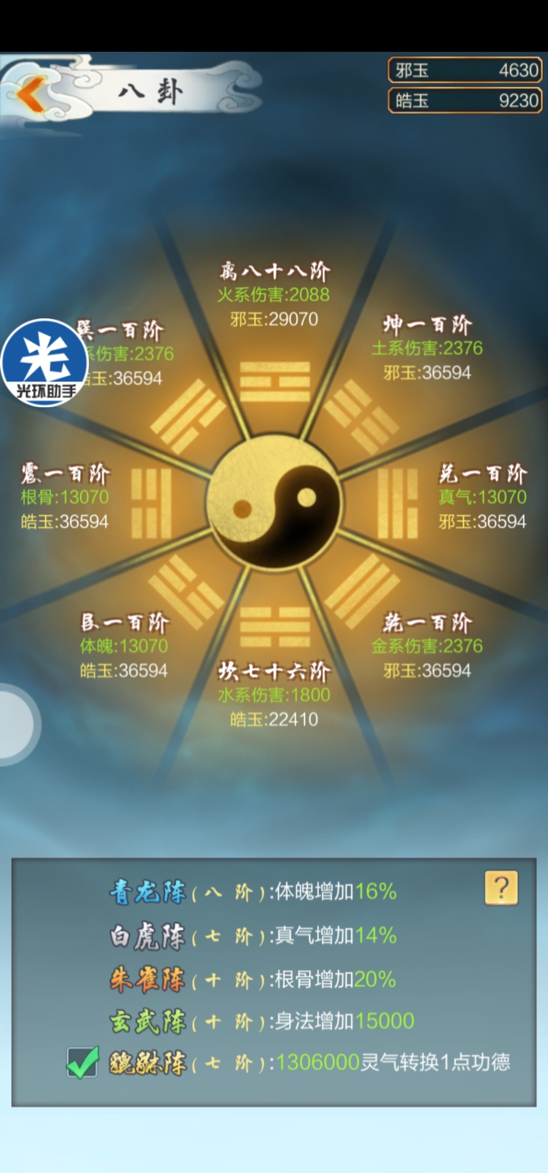 八卦:八卦阵呢建议道友,将八个槽都点至10级,然后开始狂升朱雀拿根骨。