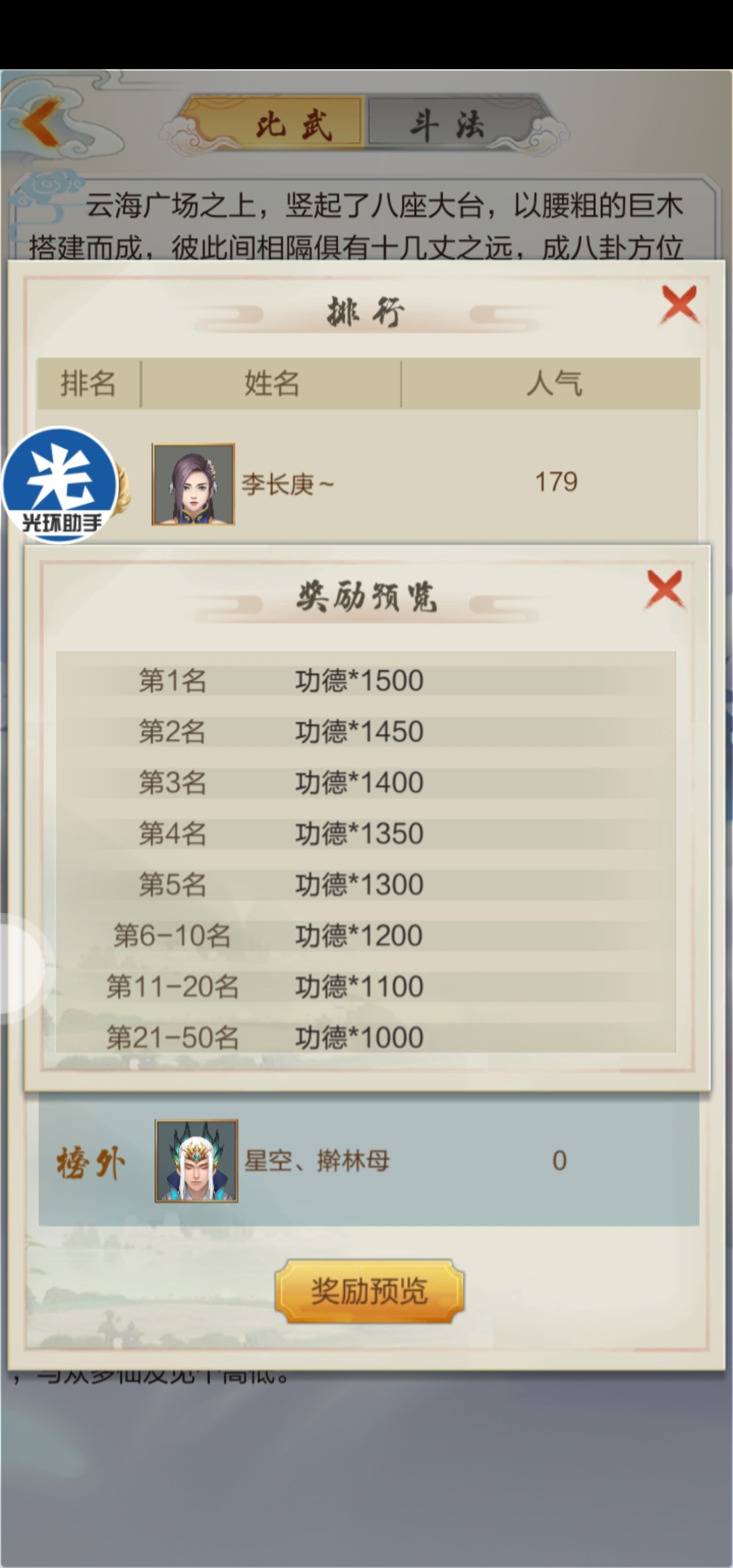 如果道友境界到达游仙,还可以参加比武,每日8点开始,晚上11点结算获取的功德将根据道友的人气值所定的排名来算