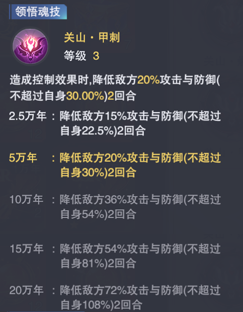 接着是第三个可供控制系魂师佩戴的【关山·甲刺】,其主要的效果为在施加“控制状态”时,可以降低对方的攻击与防御,不过这里有一定的上限,其主要是按照施加者的属性比例来限定。