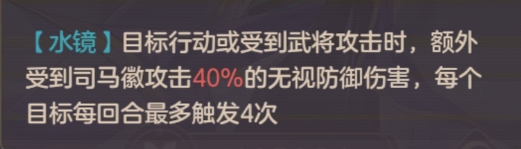 分析:敌人被添加水镜效果以后,每次行动或者是受到攻击都会受到司马徽本体的攻击伤害,并且水镜效果每回合可以触发4次。