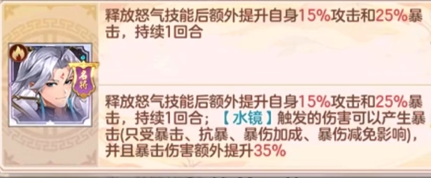 分析二:当司马徽到达10星以后,又来到了另外一个阶段,水镜状态下的所有敌人都会降低抗暴和暴减,重点来了,水镜状态下的敌人受到伤害可以减少怒气500点和回复自身125点的怒气,这个效果每回合可以触发四次!