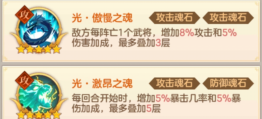 魂石推荐:光系列。傲慢+激昂+谨慎。都是加攻击和暴击效果的,谨慎可以加35%的爆伤。