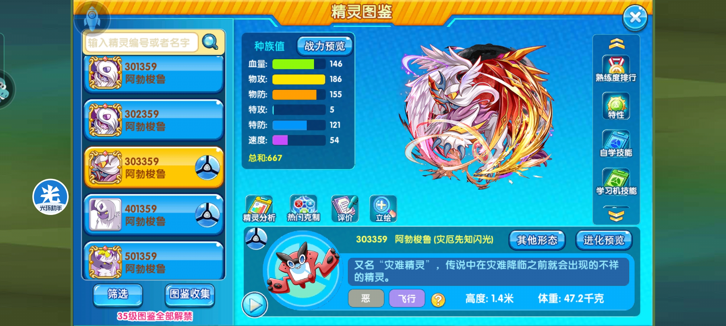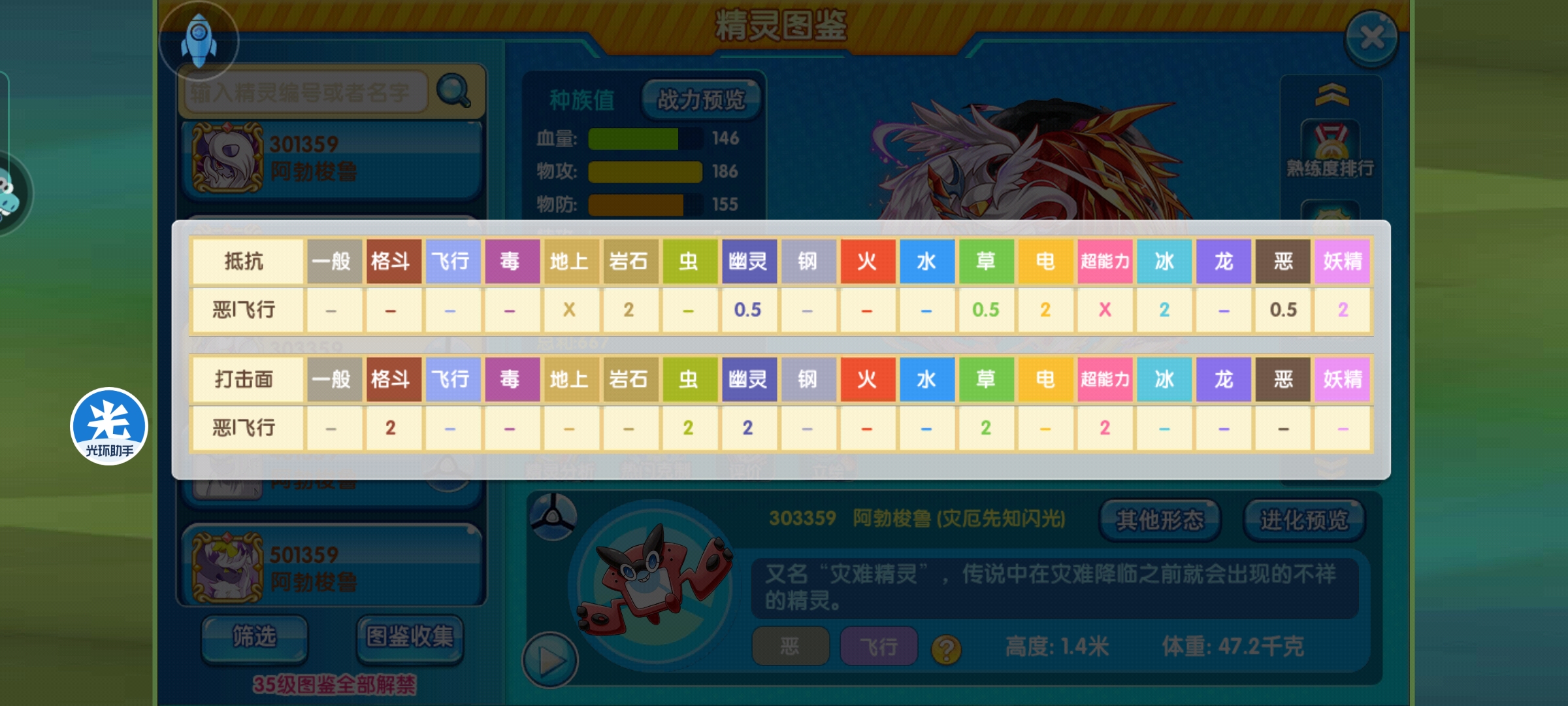 灾兽的属性为恶+飞行,这一属性搭配产生了四个二倍弱点-岩、冰、电、妖,均为pvp常见输出属性,因此,在面对此类属性的高爆发精灵时,要尽量避免对决;