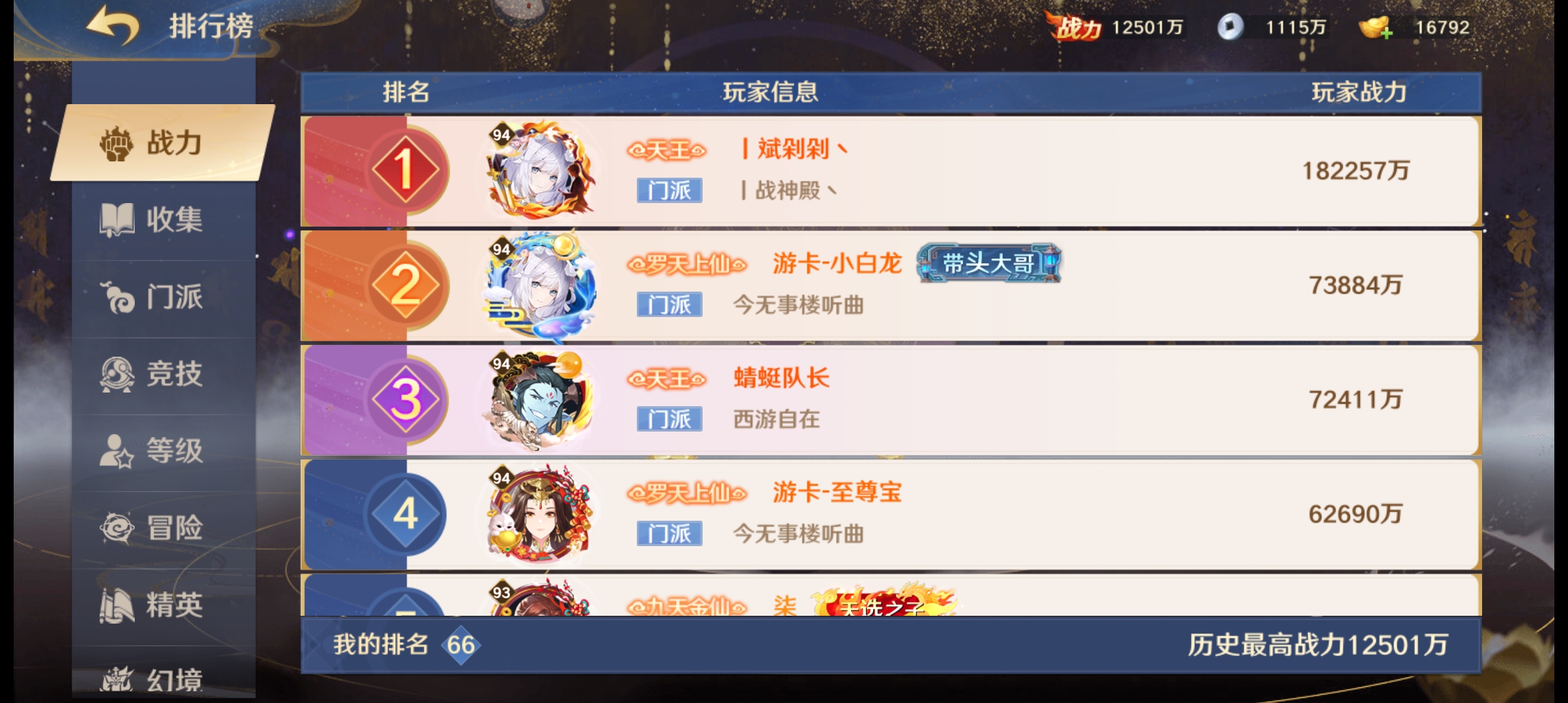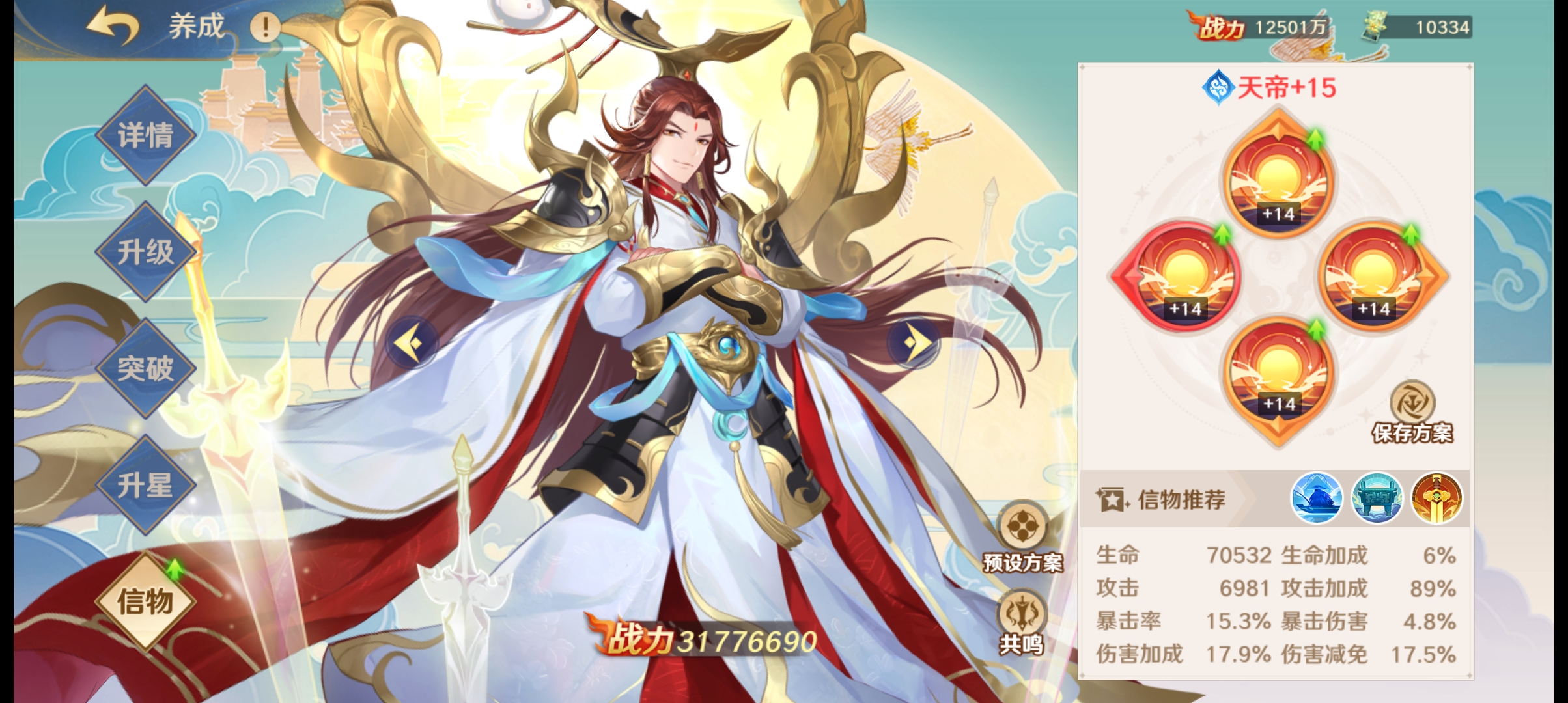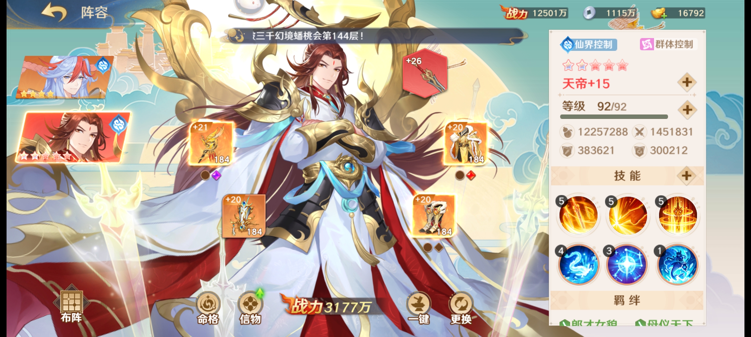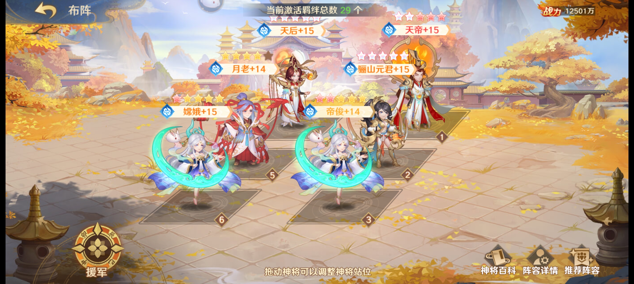 首先呢,目前战力是12501,颇有一天500万的气势,然后呢?因为之前不是打算是培养单天帝嘛,就换上了满江红。
